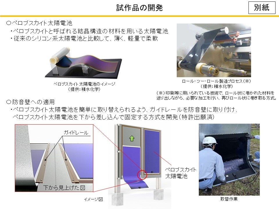 東海旅客鉄道株式会社(代表取締役社長 丹羽 俊介、以下「JR東海」)と積水化学工業株式会社(代表取締役社長 加藤 敬太、以下「積水化学」)は、ペロブスカイト太陽電池を搭載した防音壁の開発等を行うことについて共同開発契約を締結し、このたび、試作品を開発しました。今後は実用化に向けて、JR東海の小牧研究施設等で実証実験を実施致します。