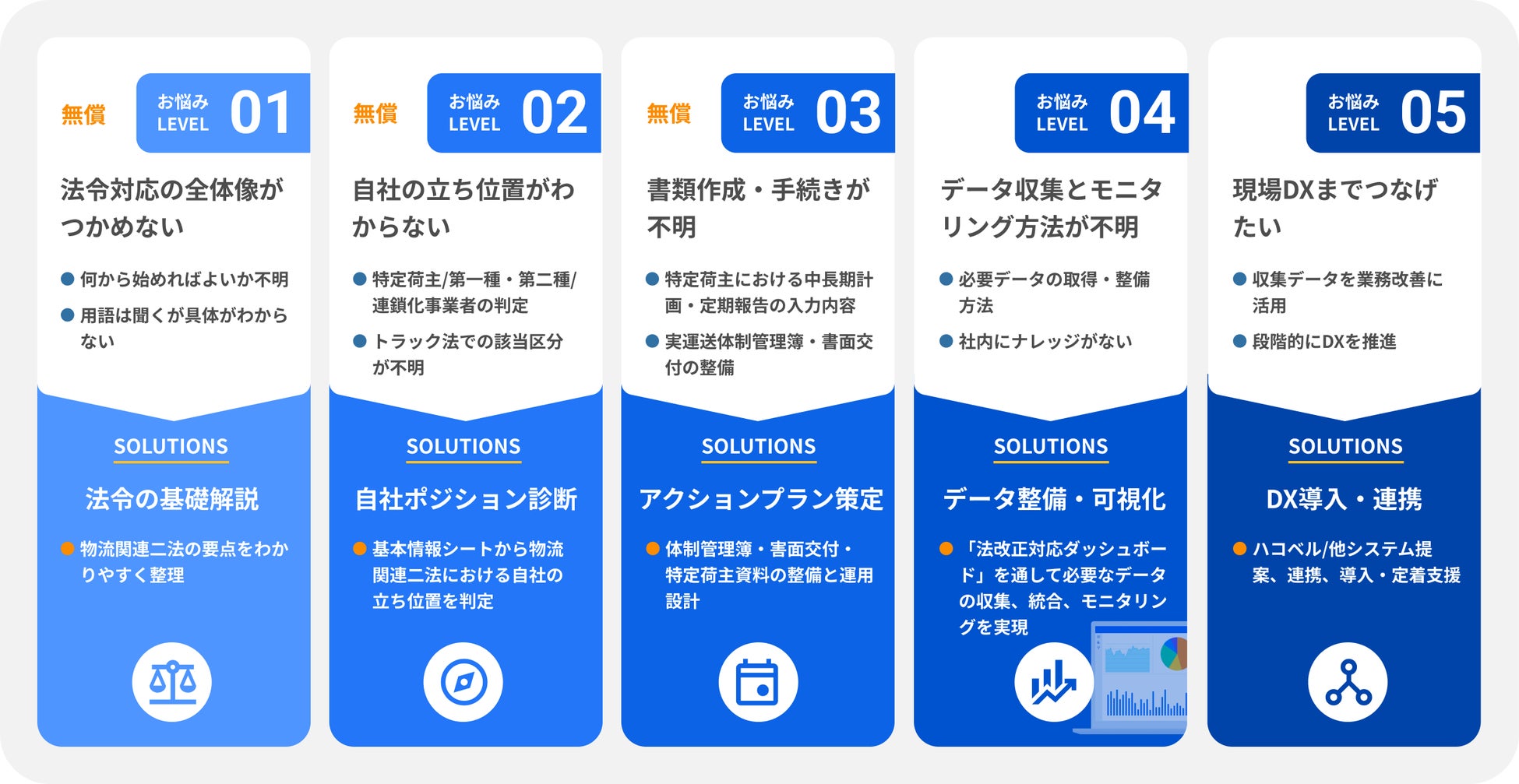 そうした声を受けて開発したのがこの度の新サービスです。現場が向き合うお困りごとの解決に取り組むとともに、物流DXシステムの提供を通じて培った経営視点を活かし、目前に迫る法改正対応やその先の業務改善・DX推進を、総合的にご支援してまいります。