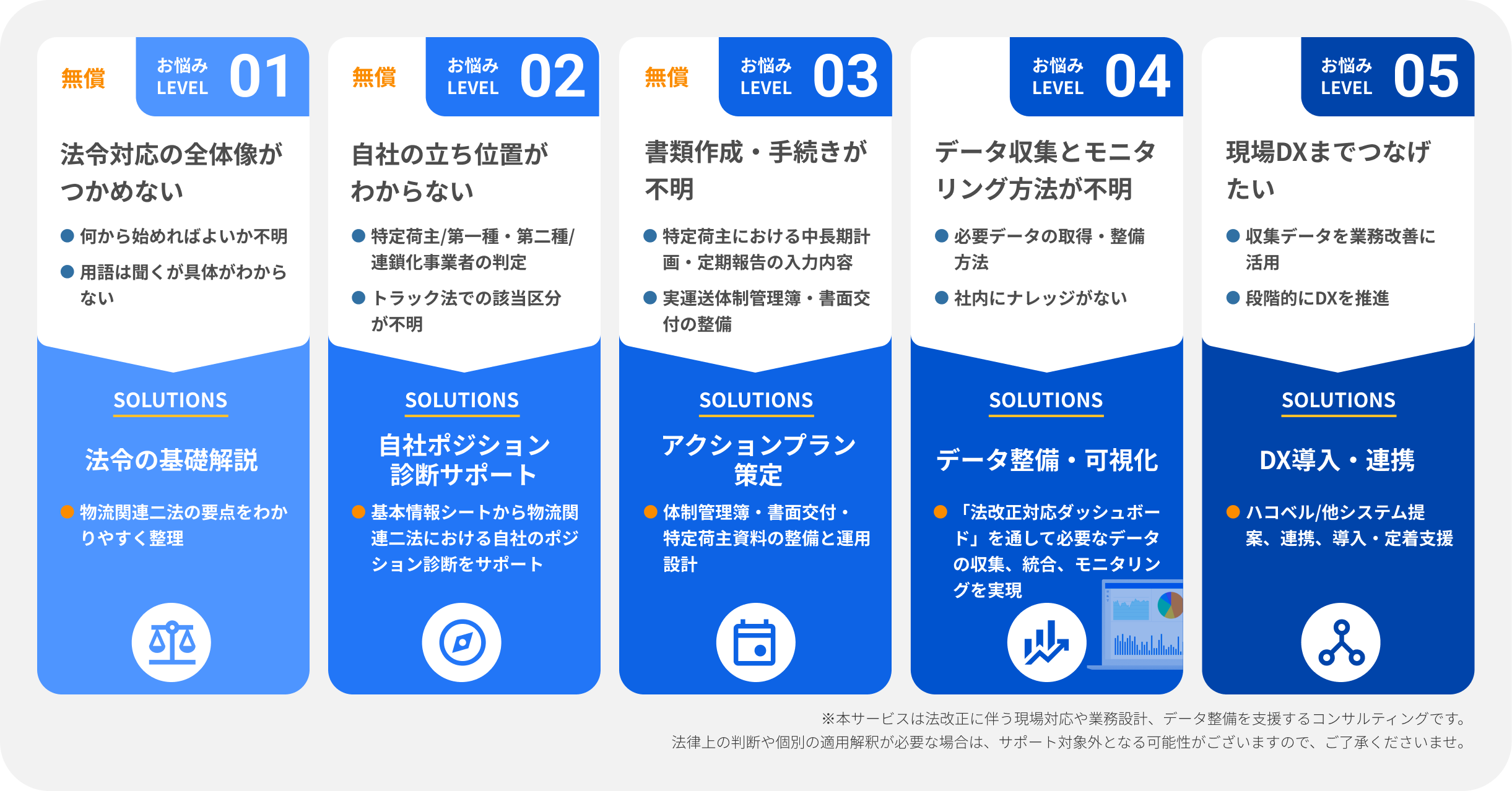 ※本サービスは法改正に伴う現場対応や業務設計、データ整備を支援するコンサルティングです。法律上の判断や個別の適用解釈が必要な場合は、サポート対象外となる可能性がございますので、ご了承ください。