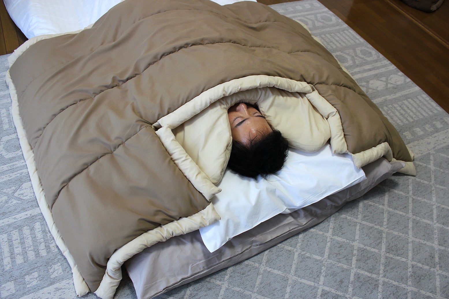 「肩ほっとねぶくろん」は肩まわりを優しく包み込んでくれるあったか寝具です。寝返りをしても冷気が入らず、朝まであたたかさが持続します。