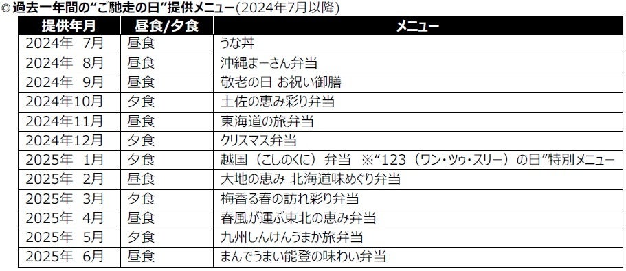 当社では、栄養バランスが整った食事を摂ることによる“体の栄養”に加え、“心の栄養”につながる取り組みとして、“ご馳走の日”を月に1回設けています。“ご馳走の日”には、各地域の食材を使用しながら、ご当地メニューなども取り入れた特別メニューを、通常のお弁当(普通食+ごはん)と同じ648円(税込)で提供。普段はなかなか食べる機会の少ない食材やメニューで、利用者が届くまでの待ち遠しさや誰かに自慢したくなる気持ちを感じられるお弁当になるよう心掛けています。