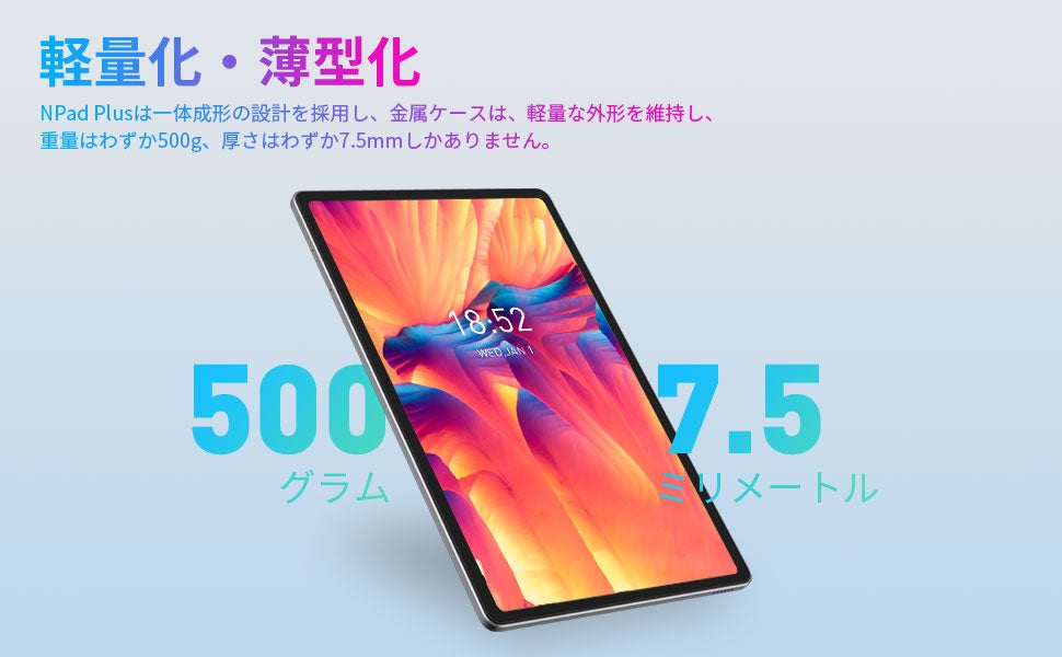 [2K 10.4インチUltra HDスクリーン+Incell ウルトラスリム構成7.8mm+13MPカメラ】2000×1200フルHD解像度、輝度300nits(Typ)の2KフルHD IPSスクリーンにより、画面表示はより色鮮やかで細部まで鮮明に表示されます。 エヌワン NPad Plus」は、アスペクト比16:10を実現し、あらゆる瞬間を鮮明に映し出します。 タッチパネルは左右を狭くして画面占有率を高め、フルハイビジョンの映像の饗宴を実現しました。 金属一体型のボディは、より高度で洗練された感覚を提供します。タブレットは最薄部7mm、重量は約500gです。 コンパクトで出張や旅行にも持ち運びやすく、13MPリアカメラと5MPフロントカメラを内蔵し、鮮明な写真やビデオ通話が可能です。 日々のオンラインミーティングや授業、エンターテインメント、写真撮影などのニーズに応えることができます。