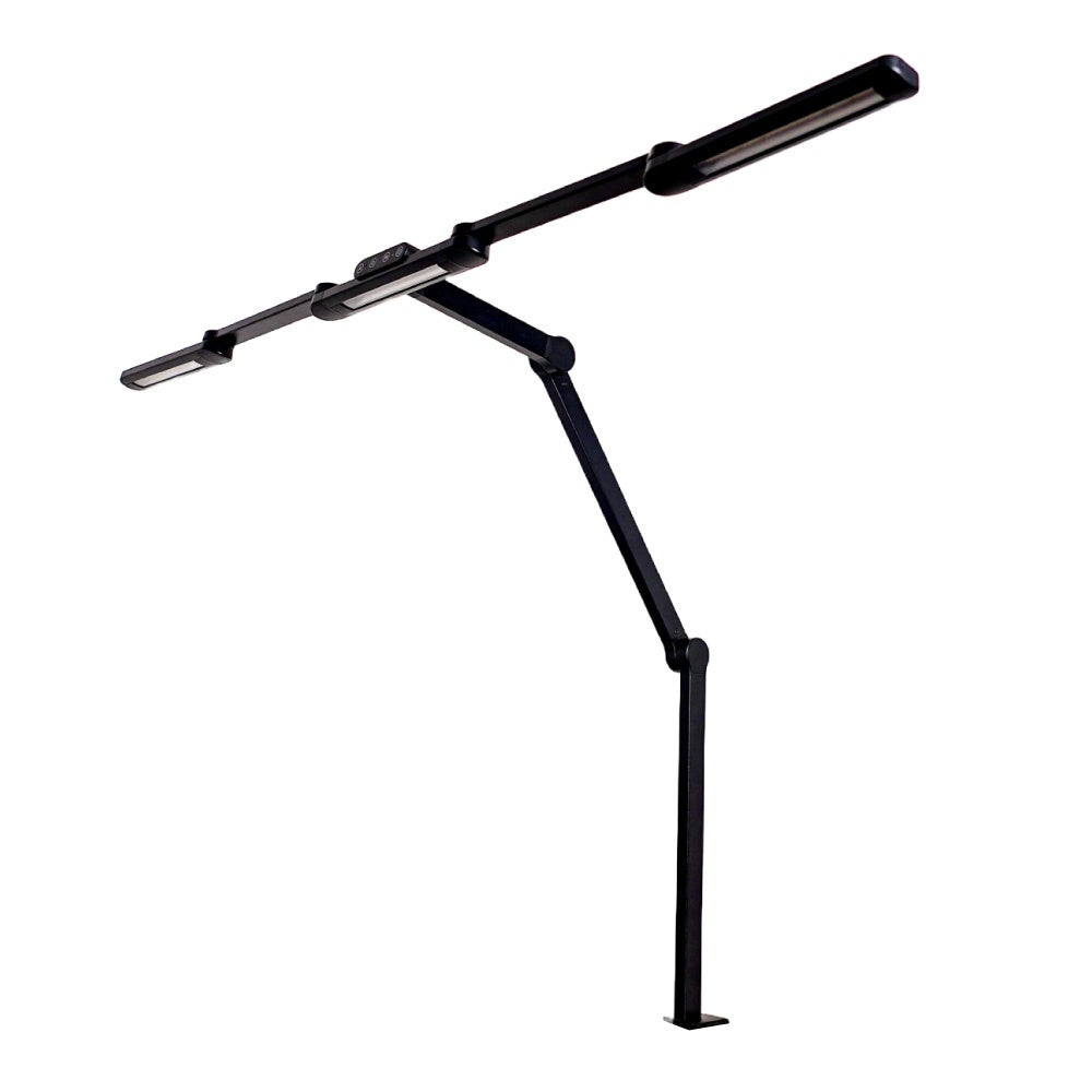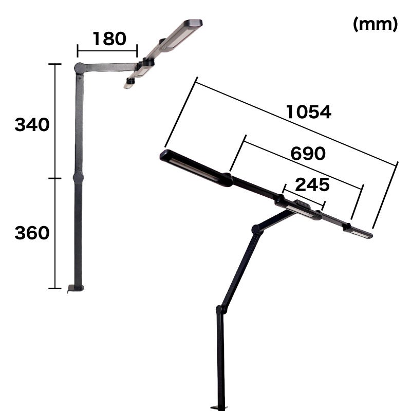お手持ちの机に挟んで固定するクランプ式。天板の厚み1~6cm、出しろ4cm以上の机に取り付けできます。最大横105cm。左右部分は180度回転が可能。左右のライトを回転させて三角形のようにすればリングライトのように顔を照らすことが可能。アーム部は2軸でそれぞれ上下に角度調整が可能でお好きな位置に固定できます。