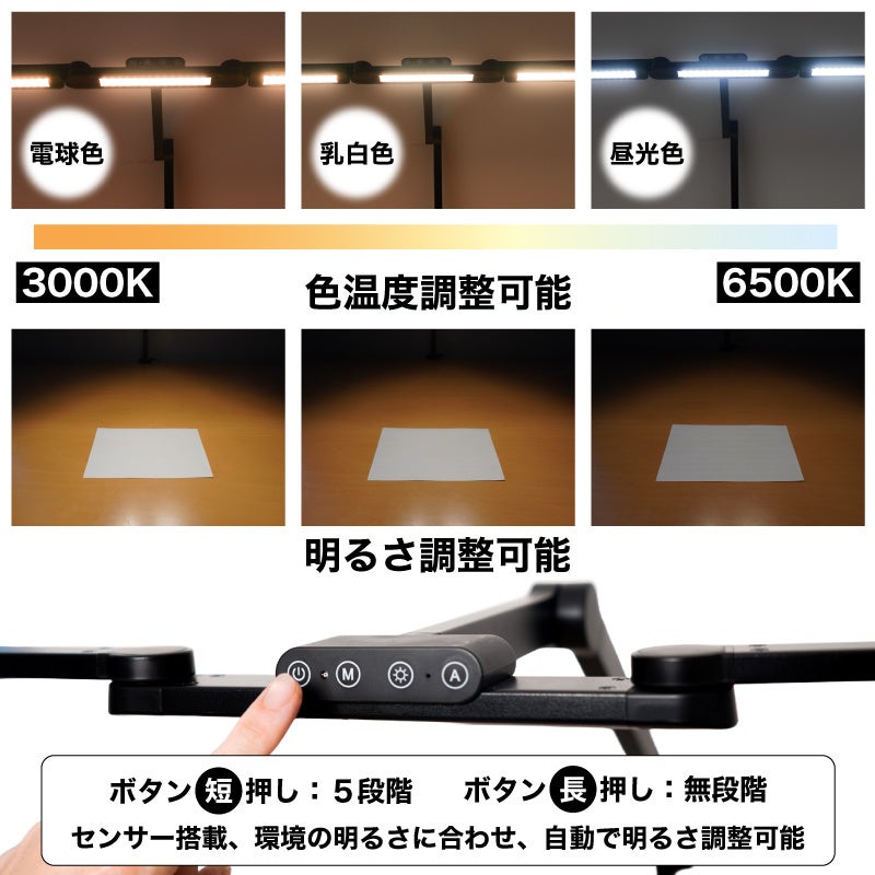 上部のタッチパネルでセンターLEDのオンオフ・明るさ調整(ワンタッチ5段階、長押し無段階)、左右(共通)のLEDオンオフ・明るさ調整(ワンタッチ5段階、長押し無段階)。3LED共通、温度(電球色~昼白色から昼光色)までワンタッチ5段階、無段階に切り替えが可能。自動明るさ調整機能搭載、設定時は周囲の明るさを検知し自動で明るさ(3LED共通)を調整します。