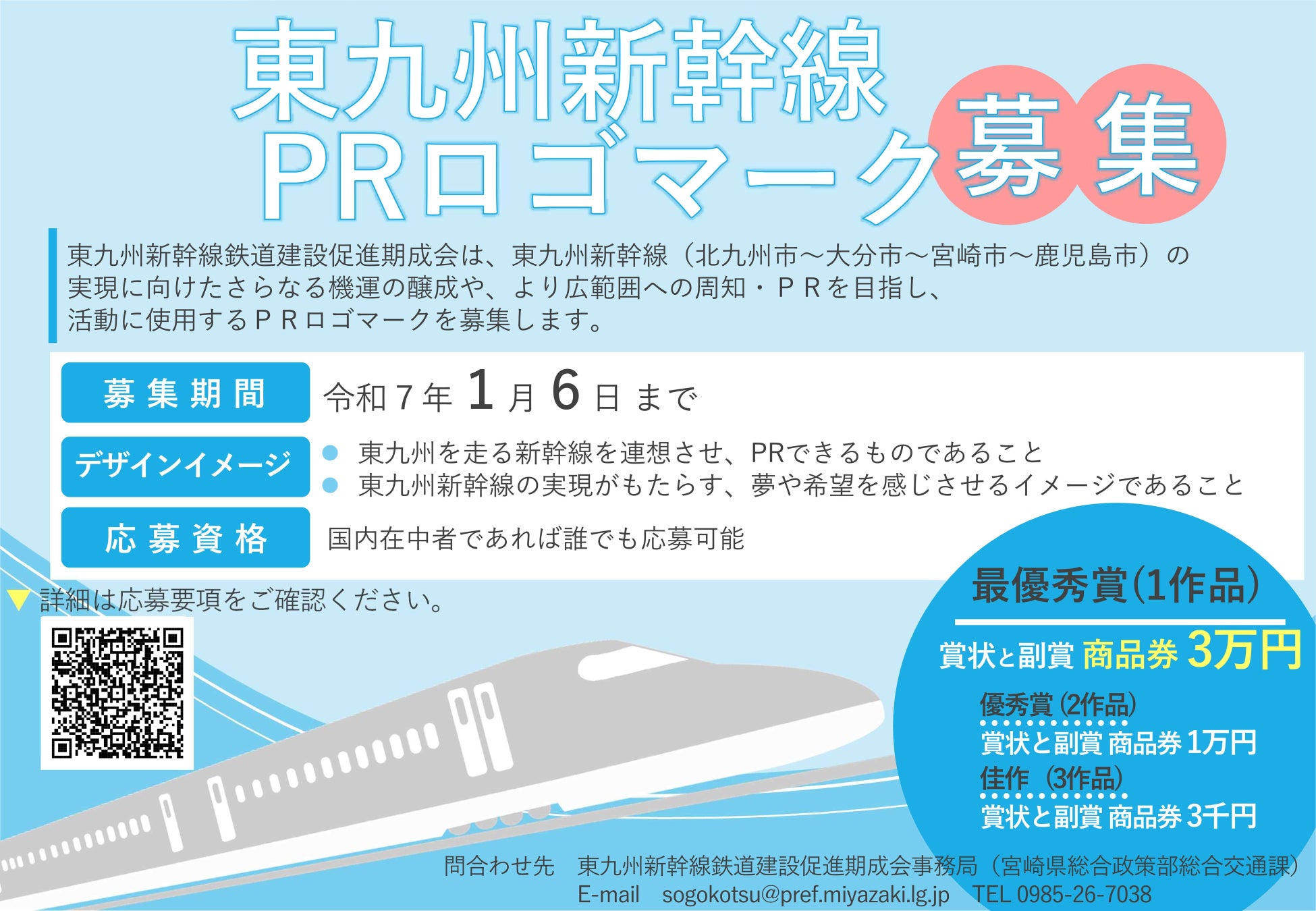 d115850-139-c868dd4e918deba3174616e7020e6748.pdf東九州新幹線鉄道建設促進期成会は、東九州新幹線(北九州市~大分市~宮崎市~鹿児島市)の実現に向けたさらなる機運の醸成や、より広範囲への周知・PRを目指し、活動に使用するPRロゴマークを募集します。
