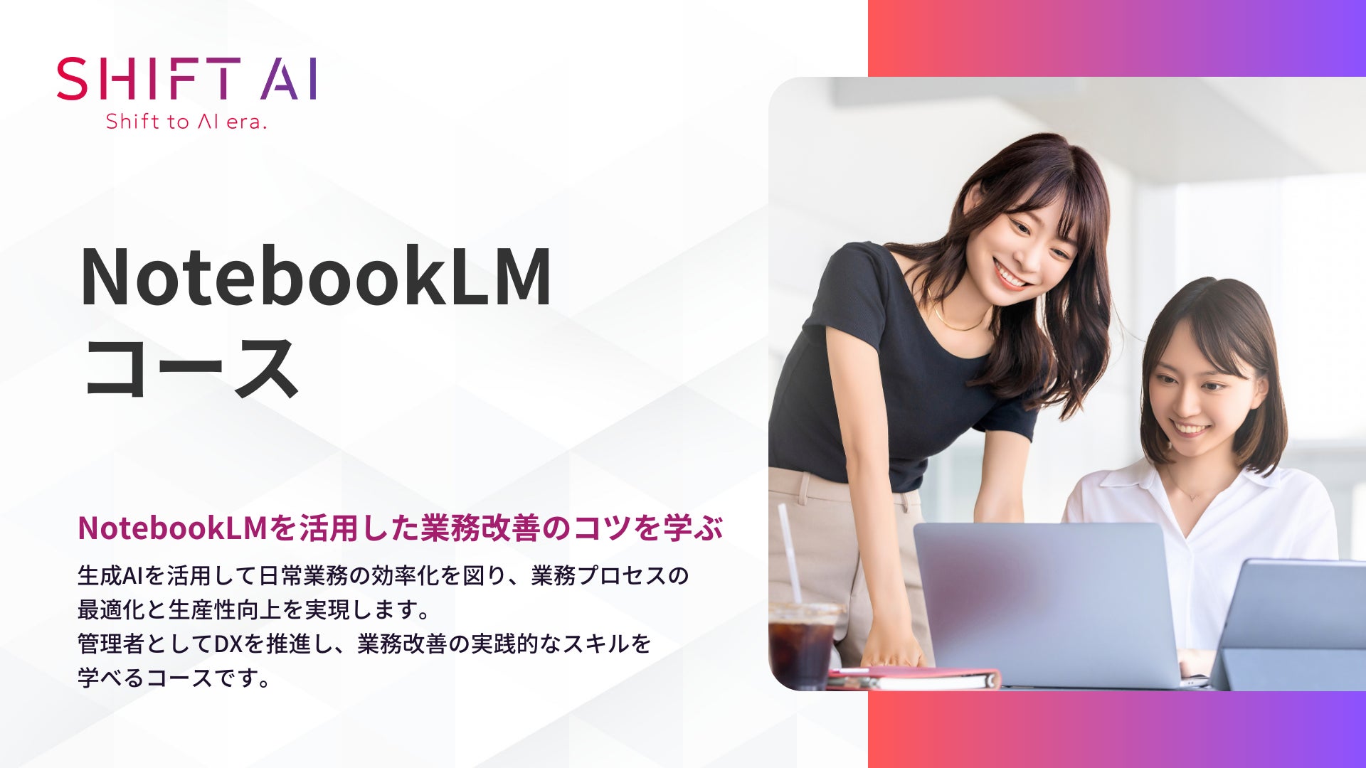 「日本をAI先進国に」を掲げAIのビジネス活用を学べる利用者数No.1※のAI大学「SHIFT AI」を運営する株式会社SHIFT AI(東京都渋谷区、代表取締役 木内翔大、以下 当社 )は、2025年5月14日、2025年2月にリリースした「NotebookLMコース」を大幅アップデートしました。