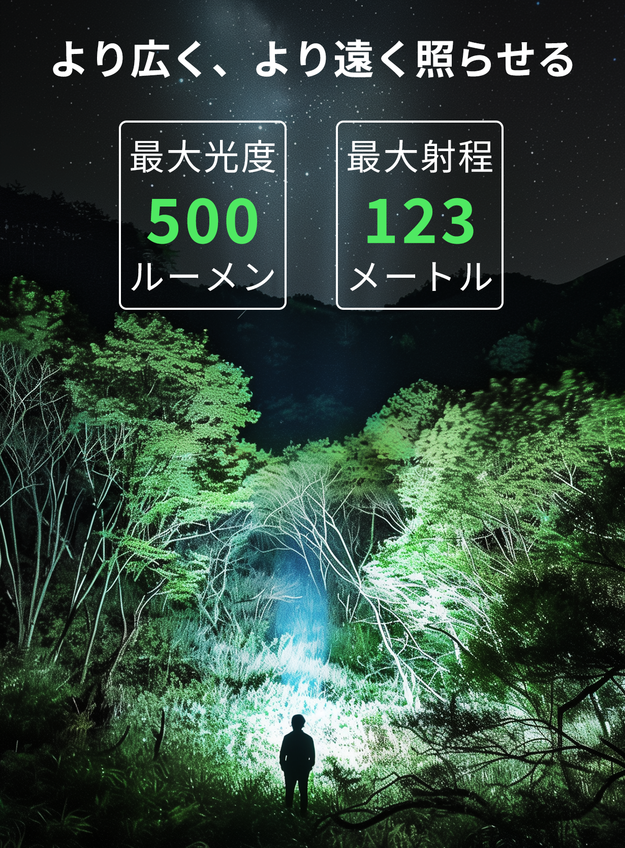 小型ながらもパワフルな性能を持ちます。高性能LEDを搭載し、驚異の500ルーメンの高輝度を実現します。暗闇の中でも視界を確保し、123メートル先まで強力に照射することが可能です。