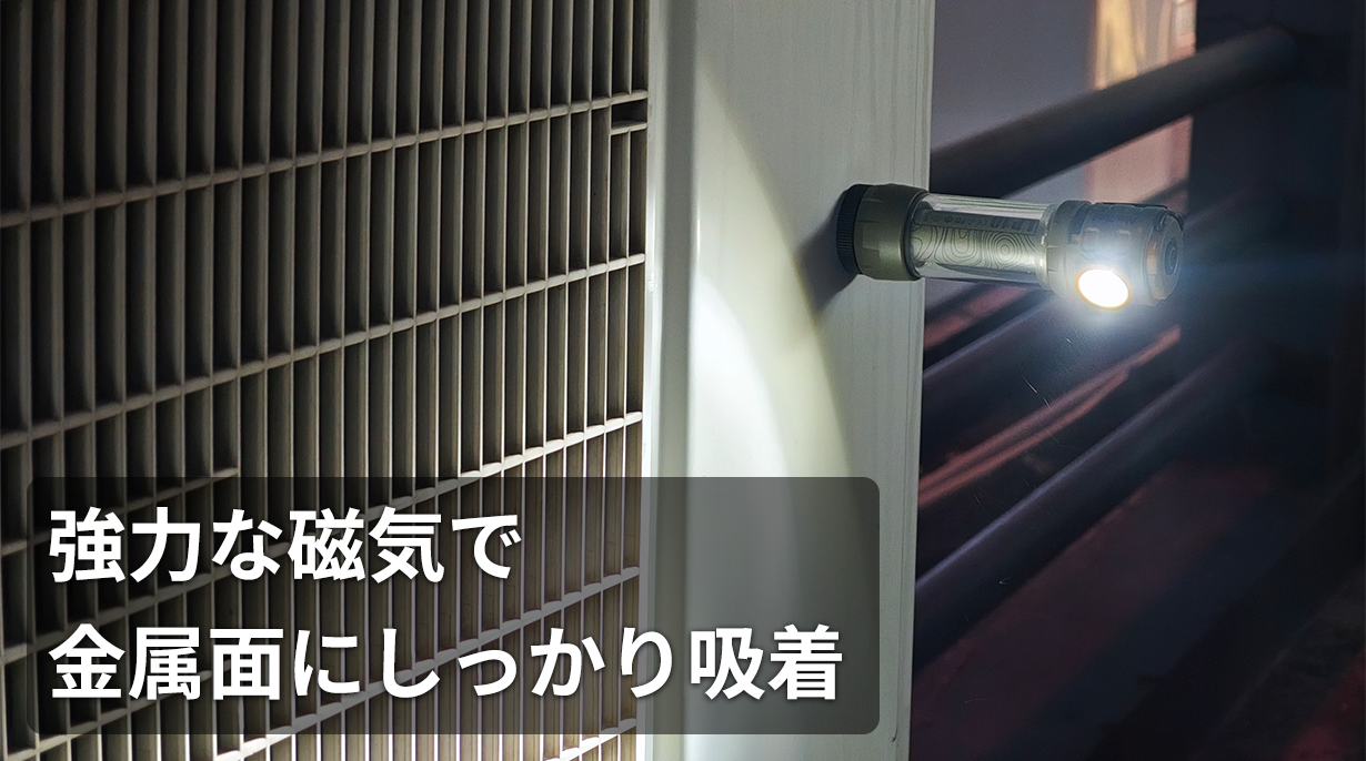 強力なマグネットベースを使えば、車のボンネットやキャンプの金属製テーブル、テント内の鉄製ポールなど、幅広い場所に簡単に取り付けられます。そのため、両手を自由に使いたいときや、光源を高い位置に固定したいときに非常に便利です。
