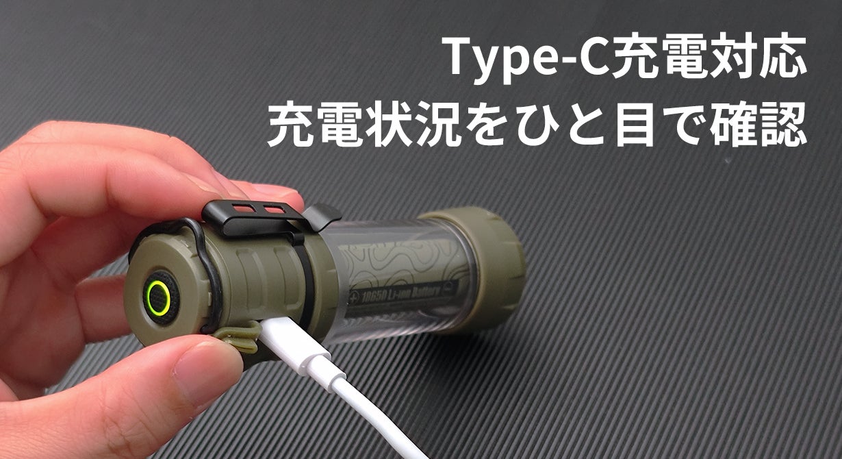 本製品はType-Cポートを備え、18650リチウム電池を使用しています。そのため、パソコンやモバイルバッテリーからも簡単に充電が可能です。