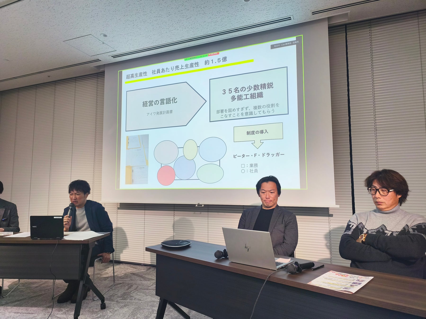 第二部では「オンリーワンの成長戦略を考える!多角化経営のヒントをつかむ!」をテーマに独自の強みを持つ3社が登壇しました。株式会社匠工房代表取締役会長の関孝治氏は、大工不足解消のために若者を育てる「マイスター高校」や、地域に必要とされるための就労支援事業、AIによる業務効率化の取り組みを紹介しました。株式会社オリバー代表取締役、小川博司氏は、バックオフィスを共有して各社が強みに集中できる「連合経営(M&A)」を掲げ、10年で30社のグループ化を