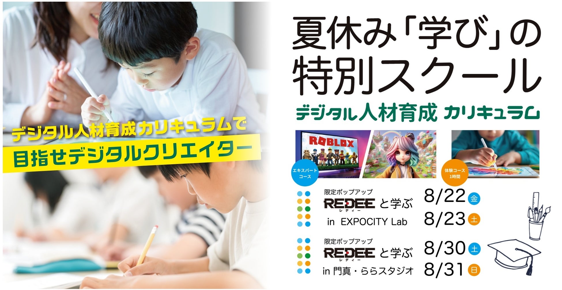 REDEE(レディー)株式会社(本社:京都市下京区/代表:代表取締役 密山 裕貴)は、2025年8月22日・23日・30日・31日に「デジタル人材育成カリキュラム」の一環として、ららぽーとEXPOCITY店、並びにららぽーと門真店にて「夏休み学びの特別スクール」を開催致します。