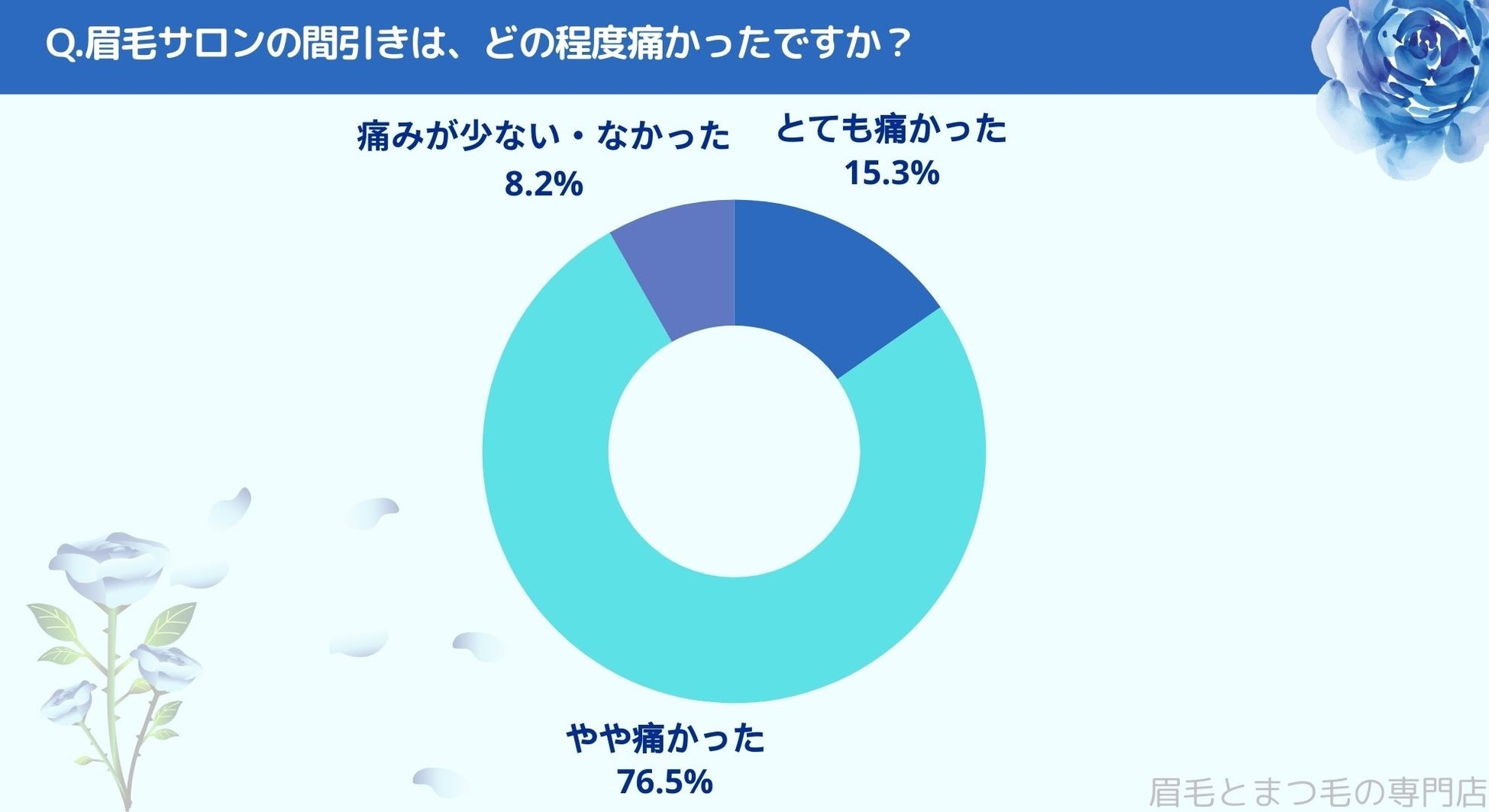 眉毛サロンの間引きが、どの程度痛かったのかお聞きしたところ「とても痛かった(15.3%)」、「やや痛かった(76.5%)」、「痛みが少ない・なかった(8.2%)」という結果になりました。