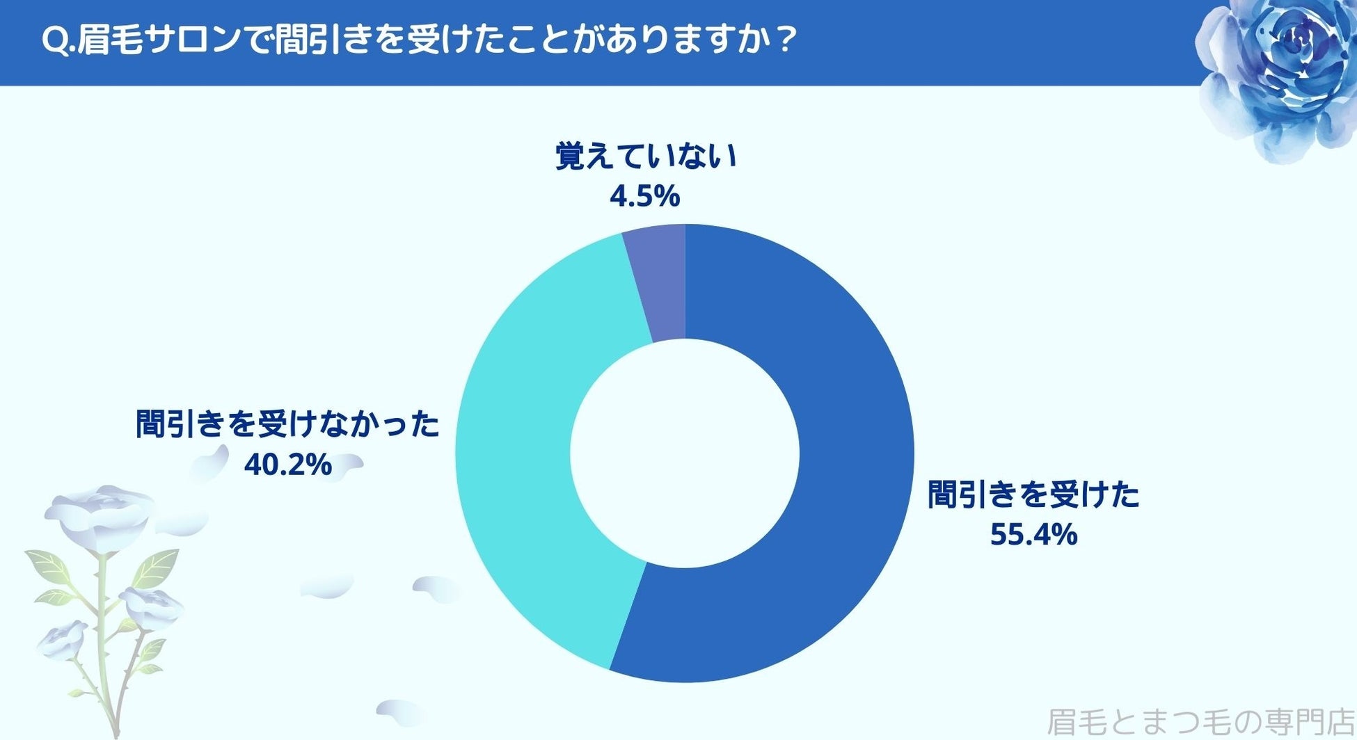 眉毛サロンで間引きを受けたかお聞きしたところ「間引きを受けた(55.4%)」、「間引きを受けなかった(40.2%)」、「覚えていない(4.5%)」という結果になりました。