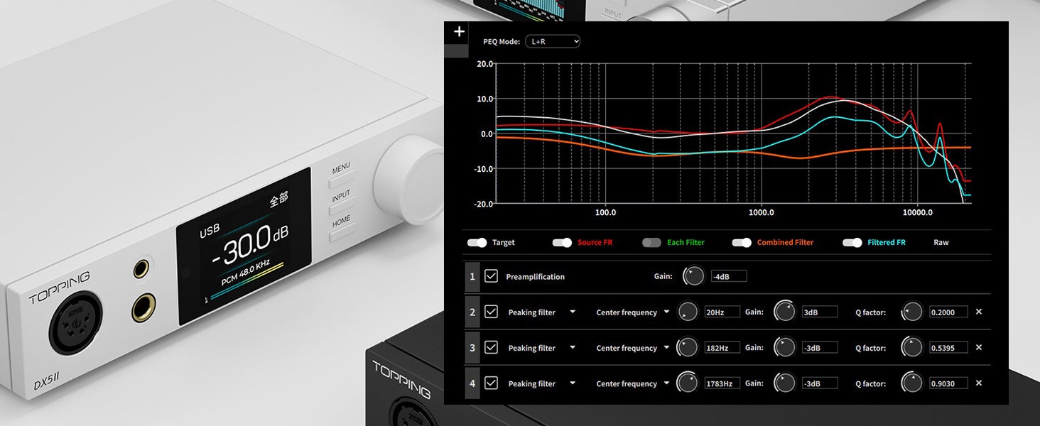 新開発のPEQ機能は、カスタマイズ可能な10バンドの周波数帯域調整に対応し、TOPPINGが独自開発したアジャストメントアルゴリズムとデスクトップソフトウェアにより、周波数・Gain・帯域幅を細かく設定することができるTOPPINGオリジナルのPEQです。