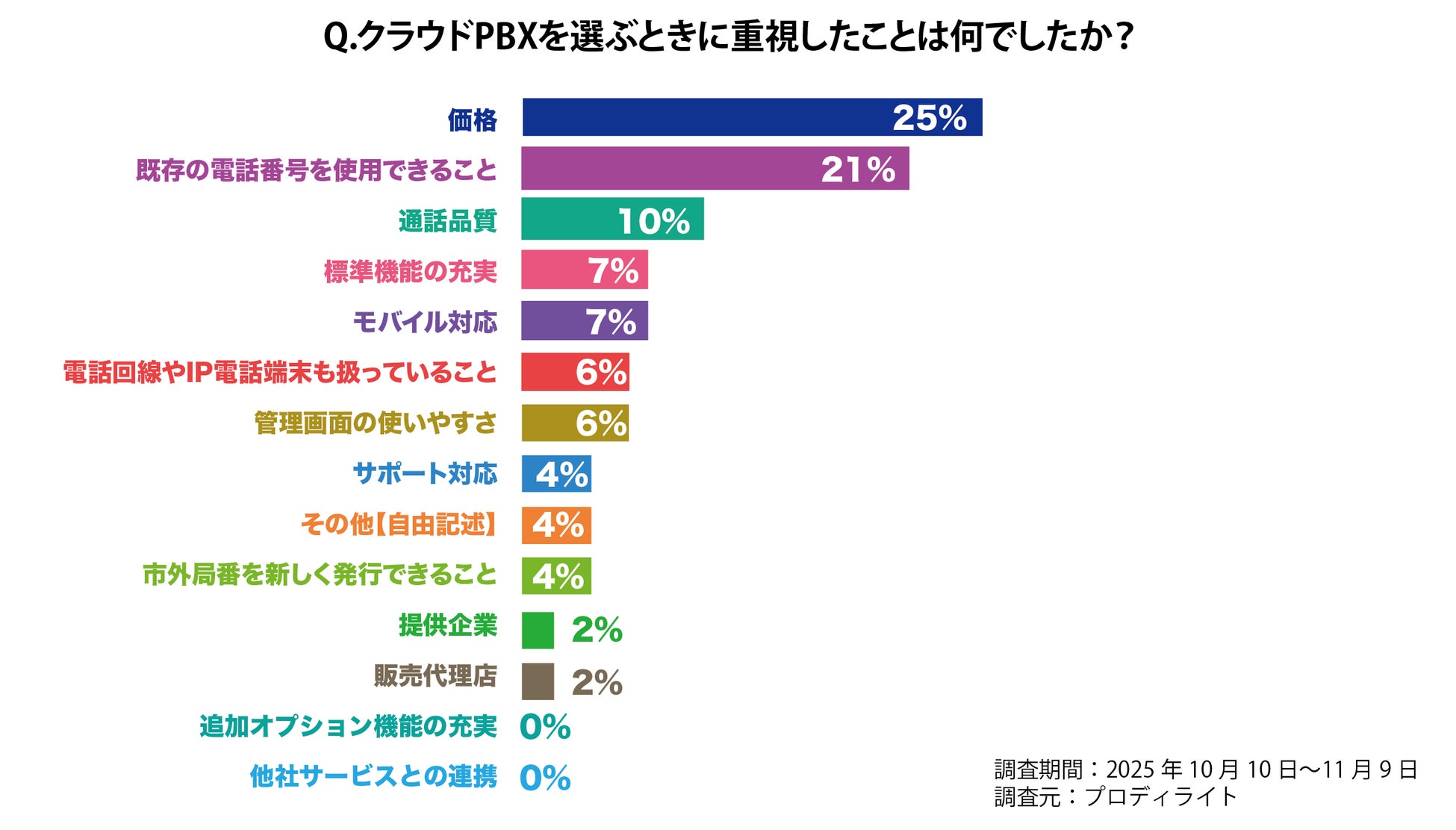 最も多い回答は「価格(25%)」となりました。続いて多い回答は「既存の電話番号を使用できること(21%)」です。これらは「機能の充実」「モバイル対応」を求める回答よりもかなり多いことから、企業は機能面よりもコストや電話番号を維持できることを重視し、堅実な選択を行うことが判明しました。