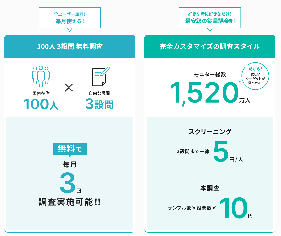 サクリサβ版としてご用意をしていた、3問以内・100名調査も引き続き「完全無料」で利用可能です。(※毎月の無料回数は3回まで)