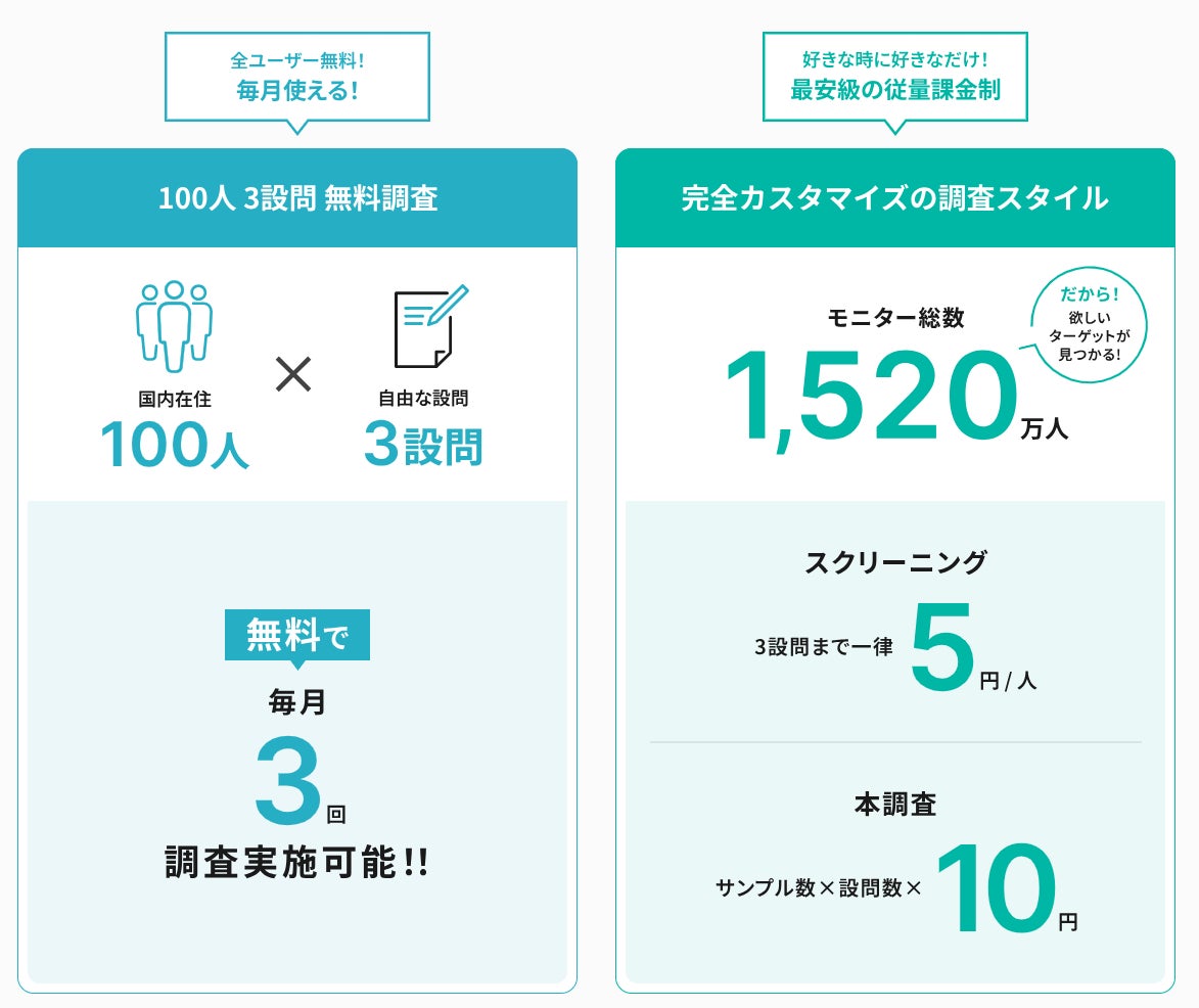 本番サービスでは最大1,000名の回答データが収集可能になりました。より具体的な調査設計が可能であり、詳細な調査データ収集が実現できます。