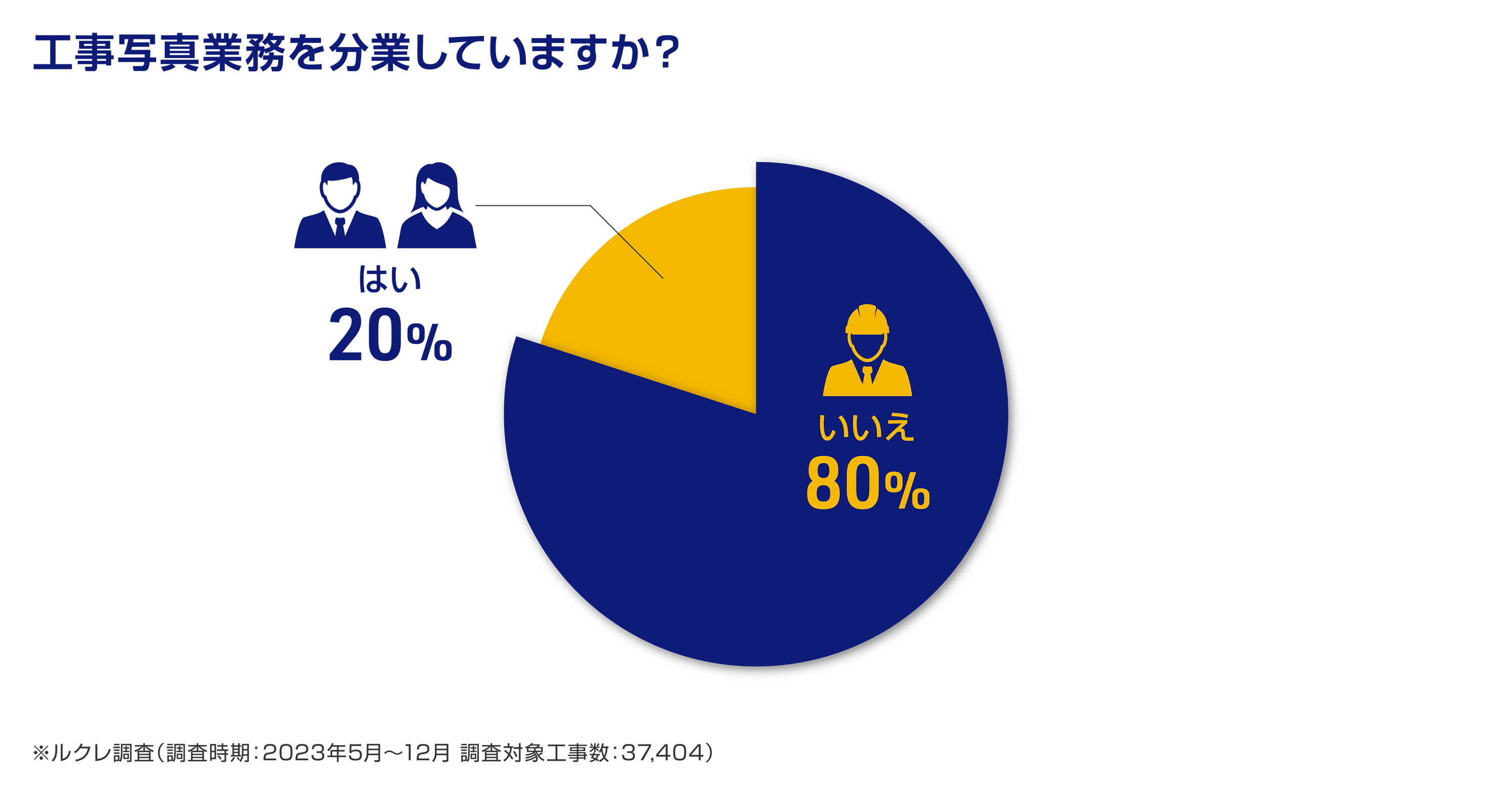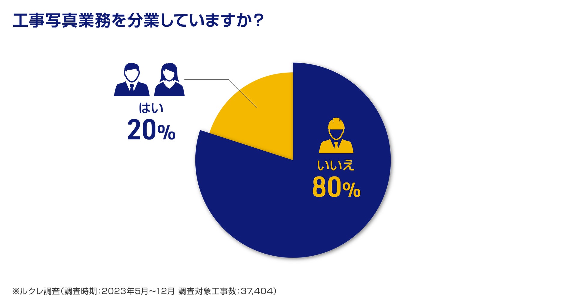 アンケート調査では、工事写真業務を1人で行っている現場監督の割合は80%(※)との結果が出ました。工事写真業務は、現場での業務終了後に現場監督が事務所に帰って作業を行うことが一般的で、現場監督の残業につながる大きな要因といわれています。