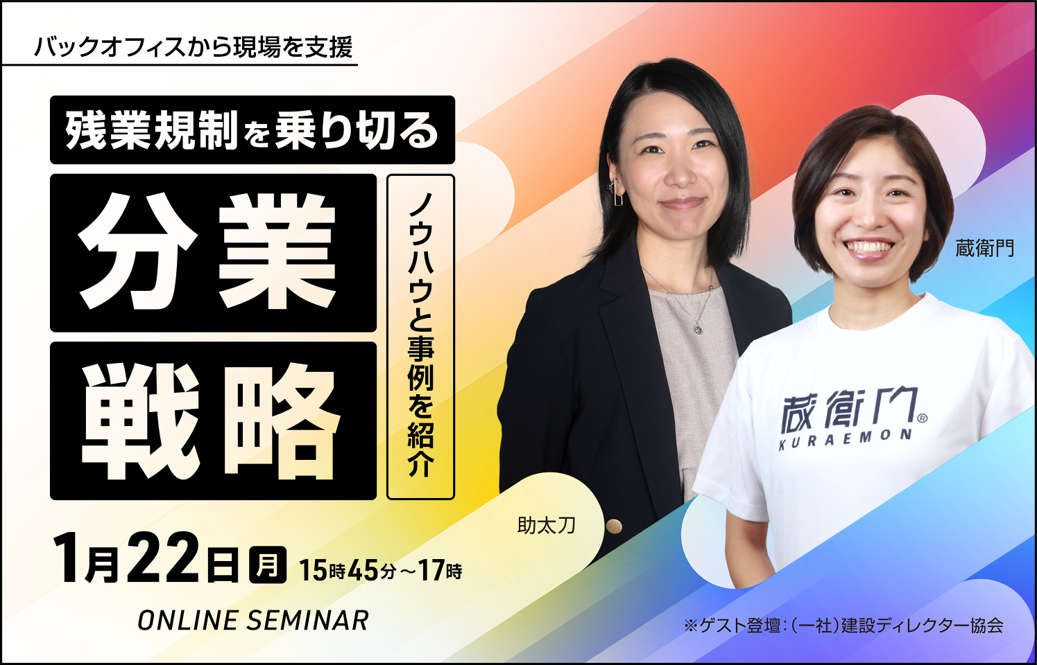 2024年4月の「働き方改革関連法」による残業規制への対応が迫っている建設業。しかしながら、施工管理者などの専門人材の採用は倍率が非常に高く難しい現状があります。そこで、これまで事務員としてバックオフィス業務に従事していた人材が、現場監督が行っていた書類作成などの業務を担うことで、残業を削減することが可能になります。本セミナーでは分業戦略の考え方、およびノウハウと事例をわかりやすく解説、新たな人材を採用することなく残業規制を乗り切る方法をご紹介します。