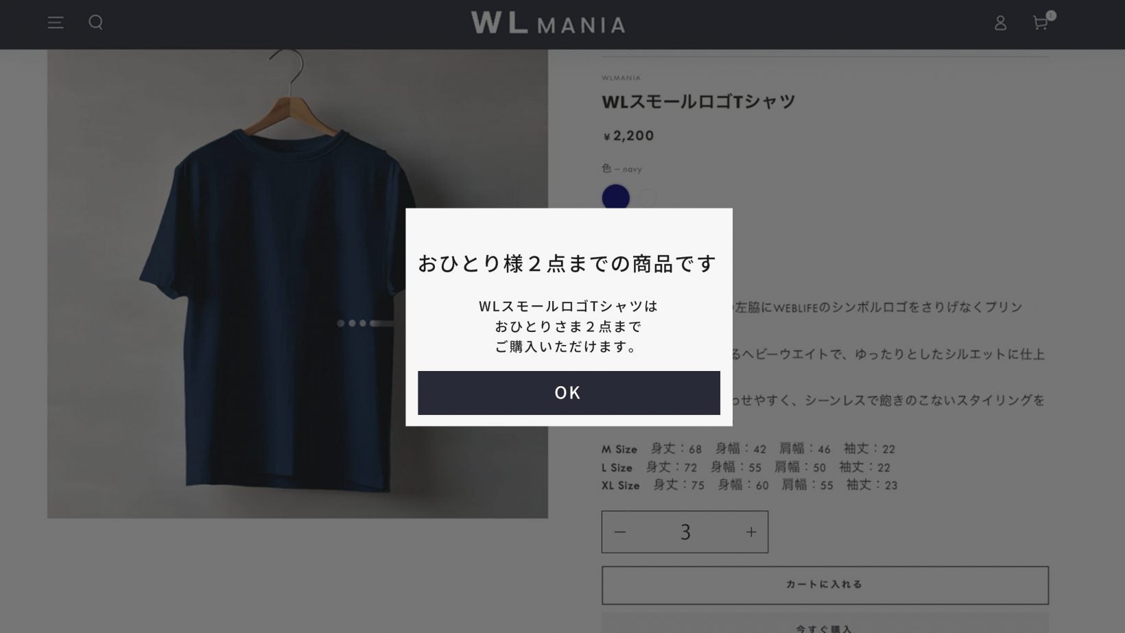 転売目的など不正購入をさせたくない商品やバリエーションごとに上限数を設定し、カートに追加した数が超過している場合はアラートを出してブロック。大量購入による突発的な在庫切れも防止もできます。アラートの文言は自由に編集でき、複数の言語を設定可能です。