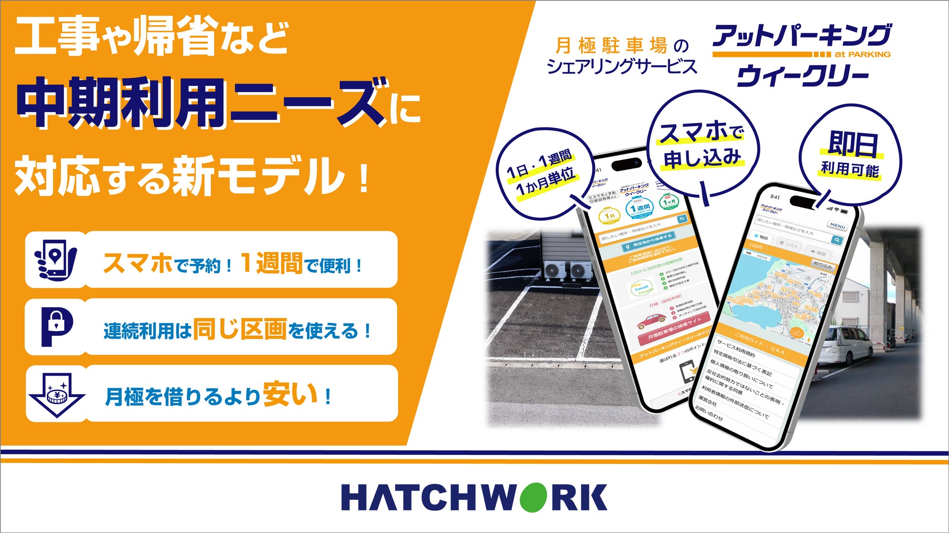 ハッチ・ワークは、このニーズに対し、「月極駐車場をウィークリーマンションのように利用できる」という新しい価値を提供する「アットパーキングウィークリー」(1日・1週間・1か月単位で利用可能)を開発しました。本サービスの導入から一定期間が経過し、実績データが揃ったため、地域貢献と収益モデルの有効性についてご報告します。