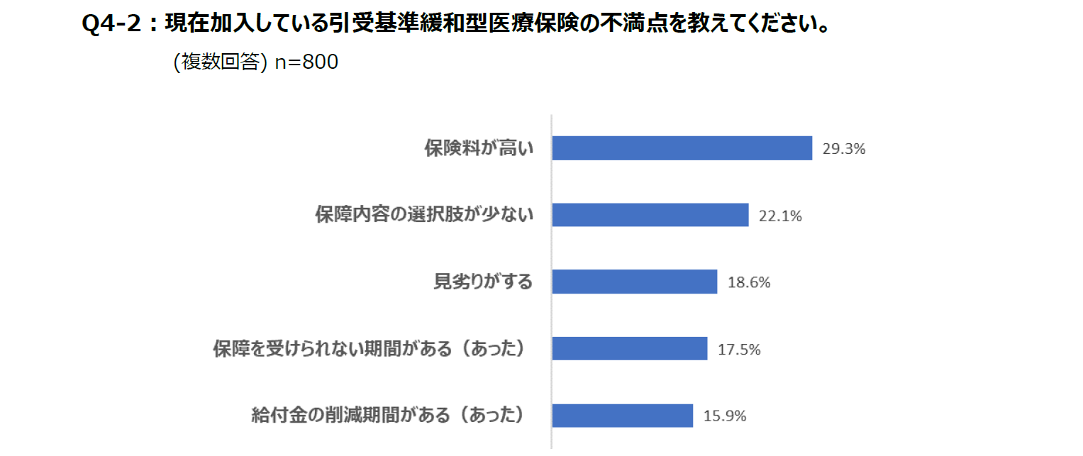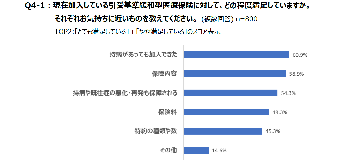 「持病があるので仕方がないと思うが、保険料が高く、もらえる給付金の額も少ないこと。(50代女性)」「通常の医療保険と比べて、保障の内容が薄く感じるため。(60代女性)」などの声がありました。最近では、保障を受けられない期間や給付金の削減期間がある保険商品は減ってきているものの、保障内容の選択肢が少ないことや保険料が高い点については、今でもあまり満足されていない結果となりました。