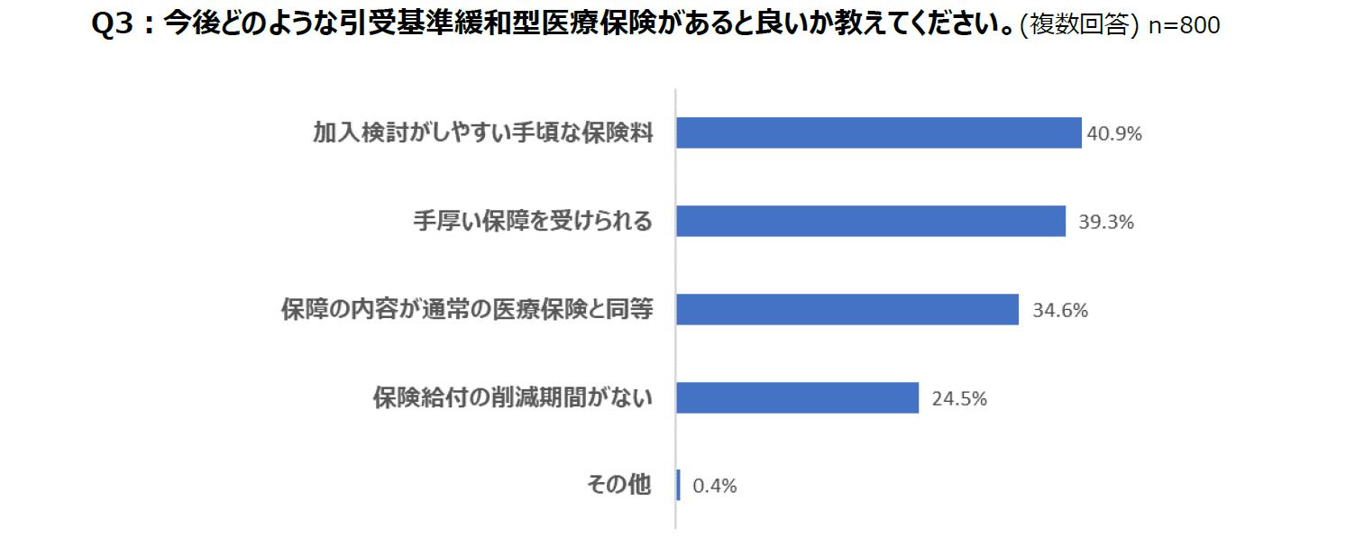 今後あると良い引受基準緩和型保険として、「加入検討がしやすい手頃な保険料」が40.9%で最も高くなりました。続いて、「手厚い保障を受けられる」が39.3%、「保障の内容が通常の医療保険と同等」が34.6%となりました。手頃な保険料で、通常の医療保険とそん色のない保障を求められていることがうかがえます。