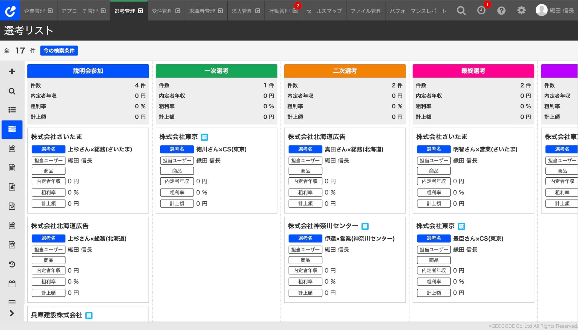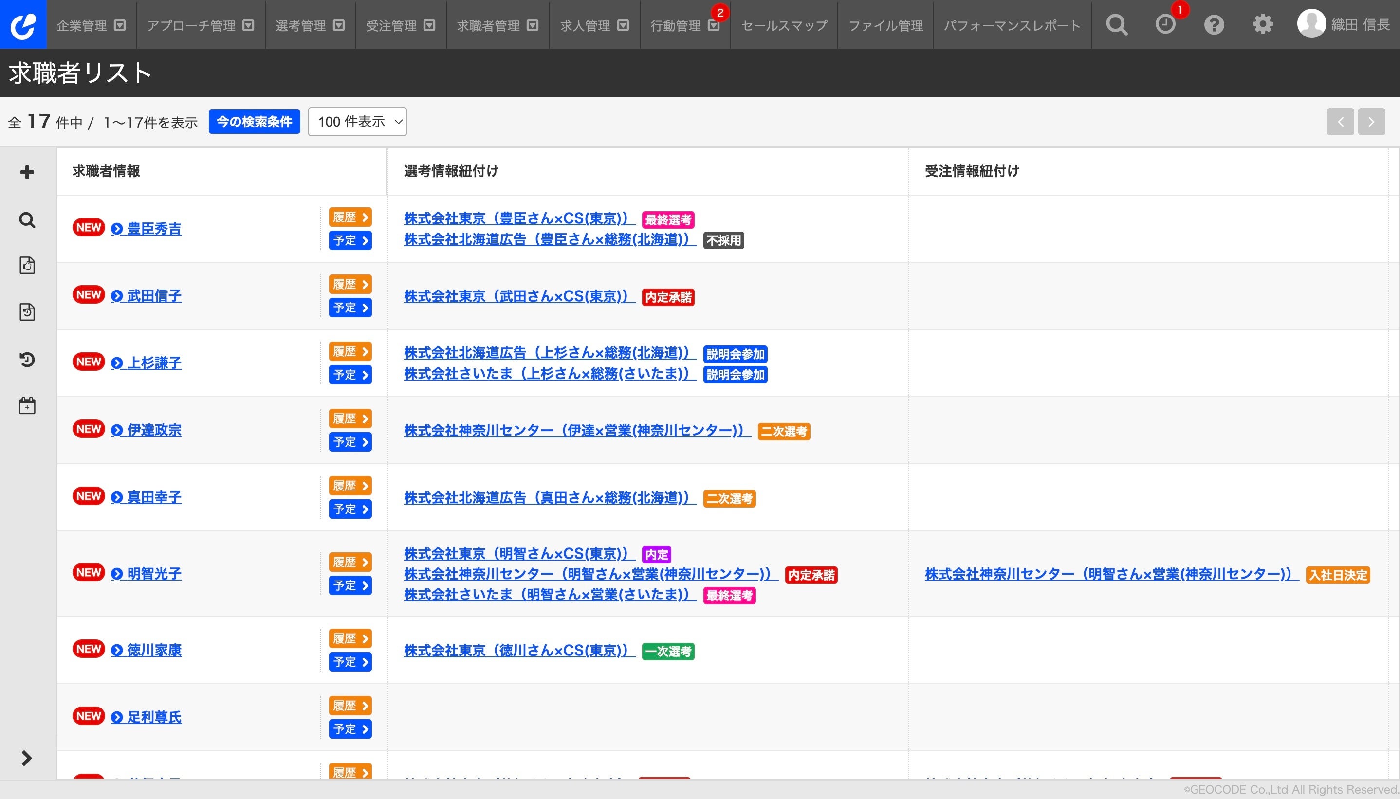 このオブジェクトは、管理項目に「選考中」や「内定」などが登録されており、求職者の状況を一覧で把握することができます。求職者と求人を紐づけて案件登録することで、求人獲得などの営業活動から内定・入社後のフォローまで「ネクストSFA」で一元管理が可能です。