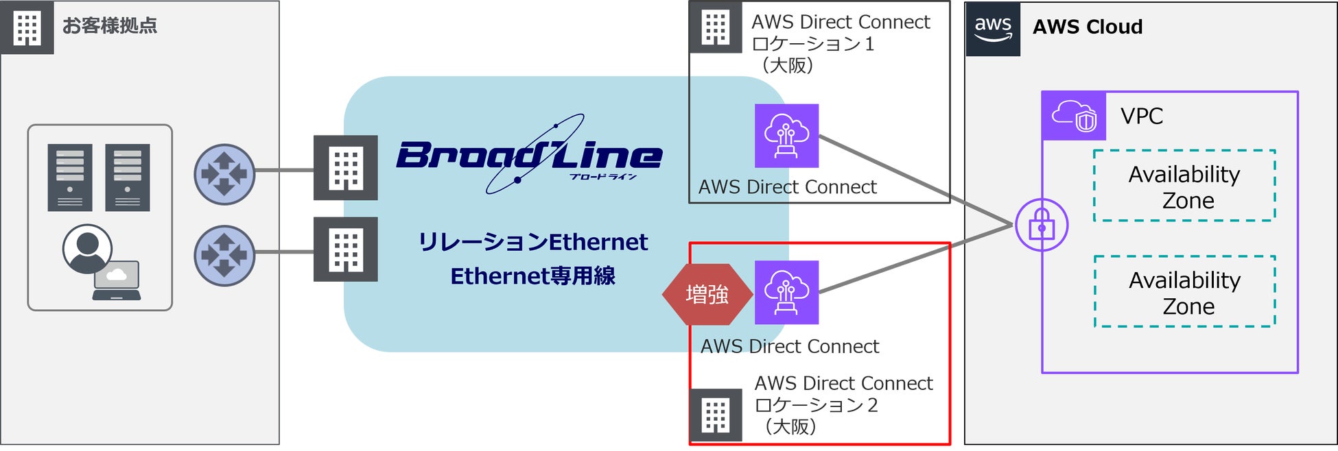 今回、大阪エリアで2か所目となるAWS Direct Connectロケーションの開設に伴い、当社の閉域接続サービスで冗長接続が可能となり、万が一の障害時にもダウンタイムを最小限に抑え、業務の継続性を確保いたします。さらに、東京と大阪のリージョンを組み合わせることで、地理的に分散した冗長接続が可能となり、可用性と耐障害性の高いクラウド環境を実現いたします。