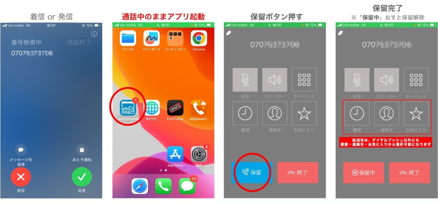今回追加された機能により、uniConnectアプリに表示されるボタンを操作することで、簡単に保留や転送ができるようになります。これにより、ダイヤルプッシュの手間がなくなり、利便性と操作性が向上します。また、転送先は連絡先(アドレス帳)やお気に入り、履歴などから選択できるようになるため、よりスピーディーな転送が実現します。