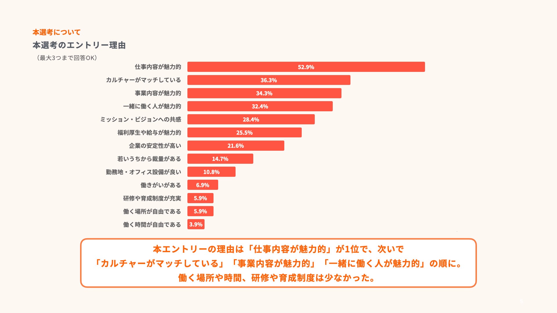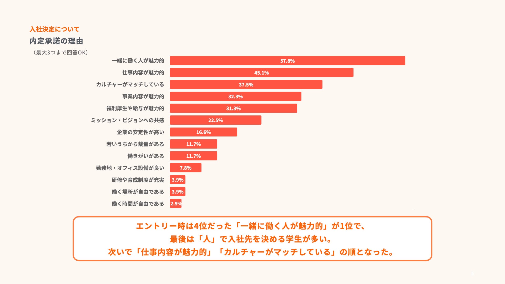 本選考のエントリー理由は「仕事内容が魅力的」がトップとなっている一方、内定受諾の理由は「一緒に働く人が魅力的」がトップに