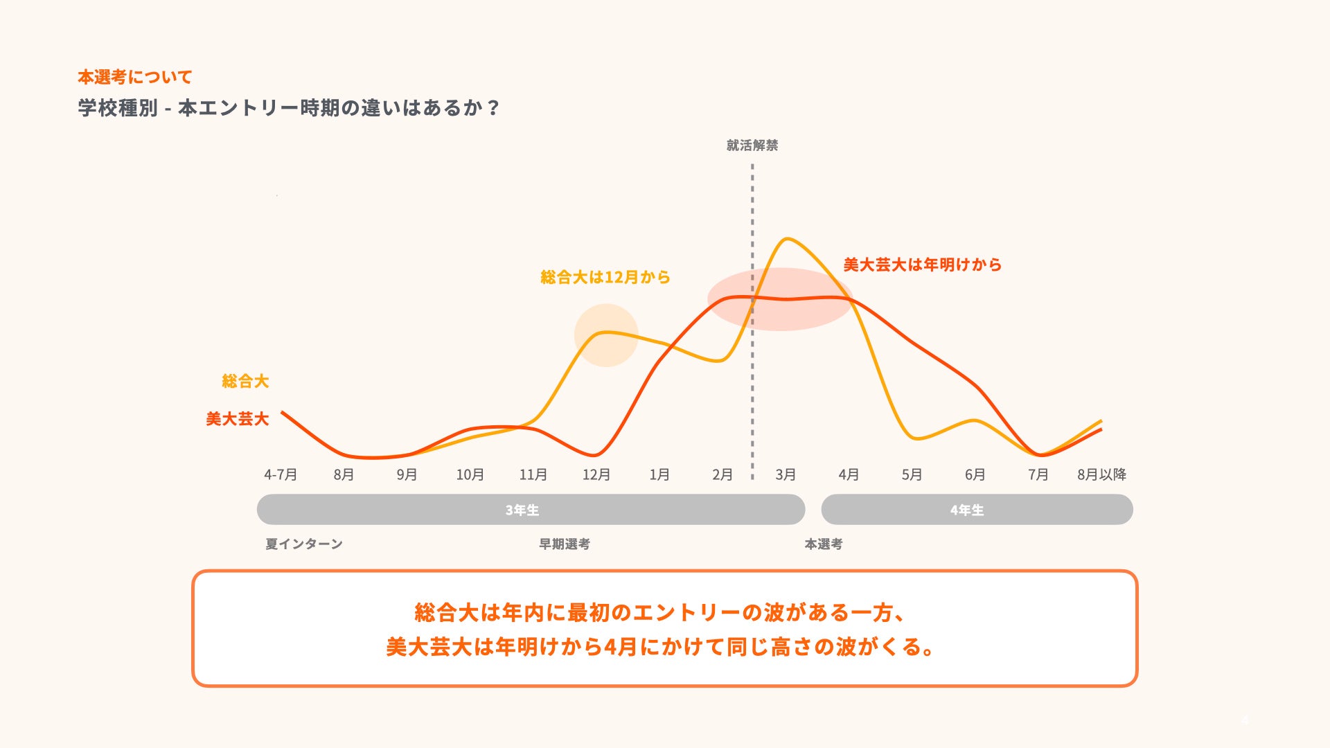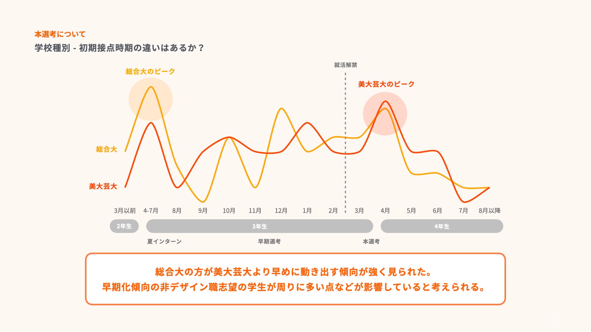 総合大学の学生の方が美大・芸大の学生より早めに動き出しており、総合大の学生は学部3年生/修士1年生の12月からエントリーを開始する傾向がある