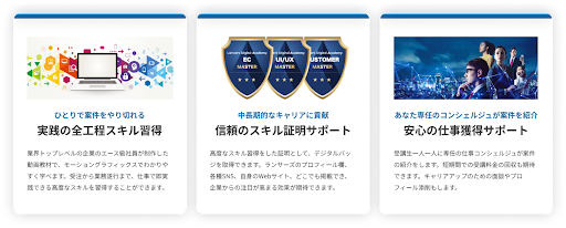『ランサーズデジタルアカデミー』は、フリーランスマッチングプラットフォーム『Lancers』の技術を活かした、ハイスキルデジタル人材育成サービスです。本サービスでは、新しいデジタルスキルを学んだ受講生に、適した案件情報を専任の仕事コンシェルジュがご紹介いたします。