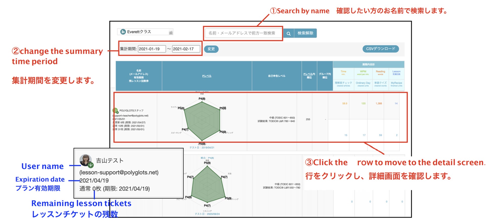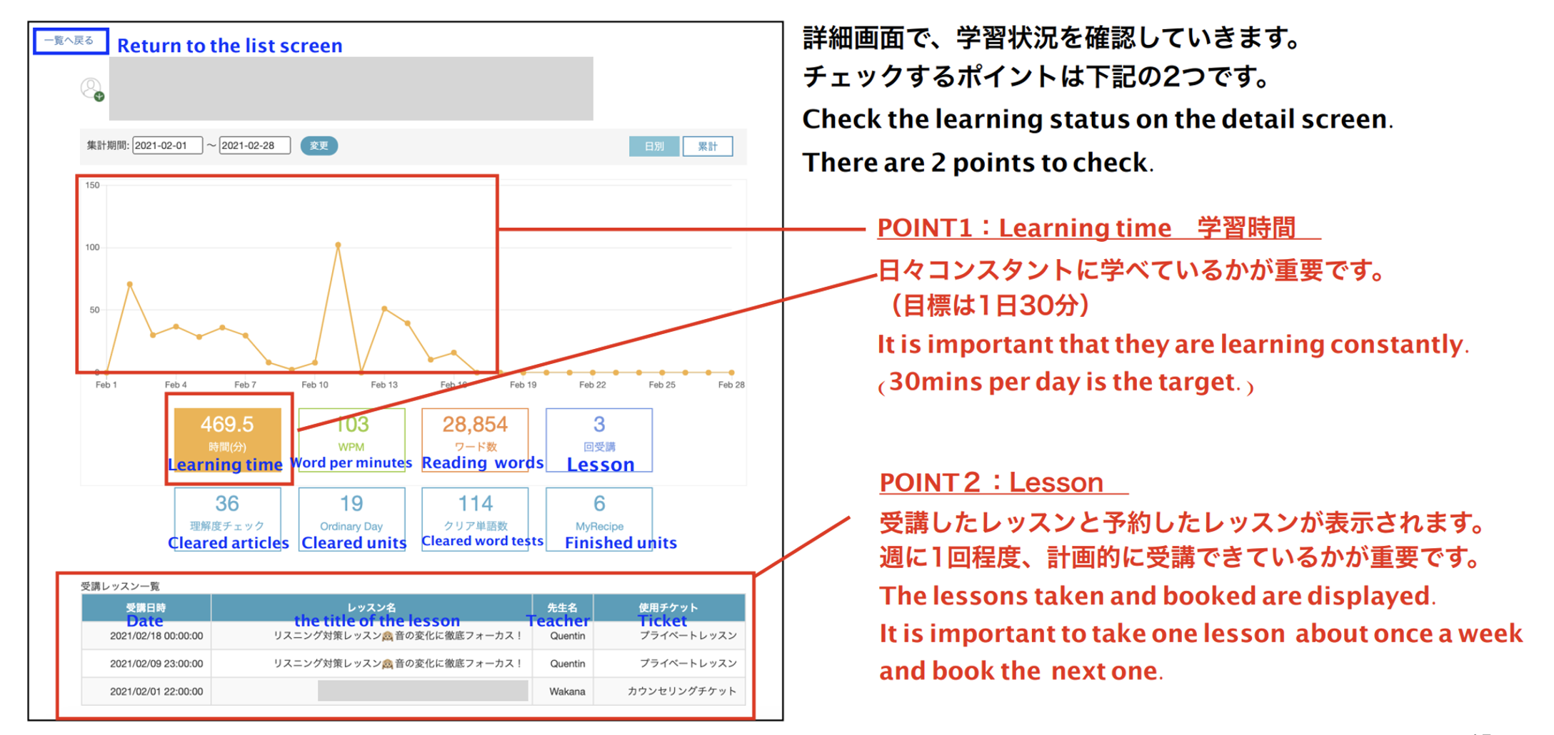 先生側には、生徒それぞれの学習進捗を専用のダッシュボードで管理が行えます。特定の学習時間の累計やクラス毎の管理などきめ細やかなカスタマイズも可能です。