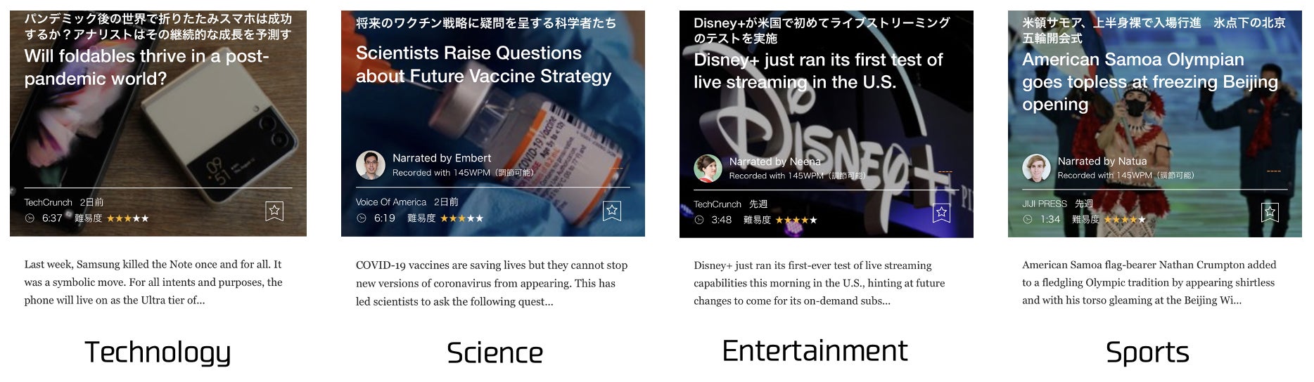 政治、経済、テクノロジー、スポーツ、エンターテイメントに至る様々な分野の最新の記事を読むことができます。今興味のある分野から英語学習をスタートできます。
