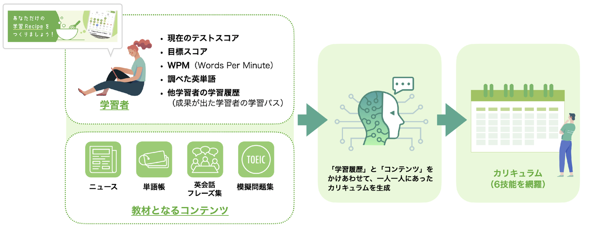 レシピー最大の特徴は、AIと先生のサポートで学習者一人一人に最適化された学習サイクルで効率的に学べる「パーソナルレシピ型」の新しい英語学習スタイルを提供してる事です。レシピーでは、単語学習からリーディング、リスニング、ライティング、発音、スピーキングまで全てのスキルを磨く学習がオールインワンで学べます。続かない英語学習は終わりにしましょう!