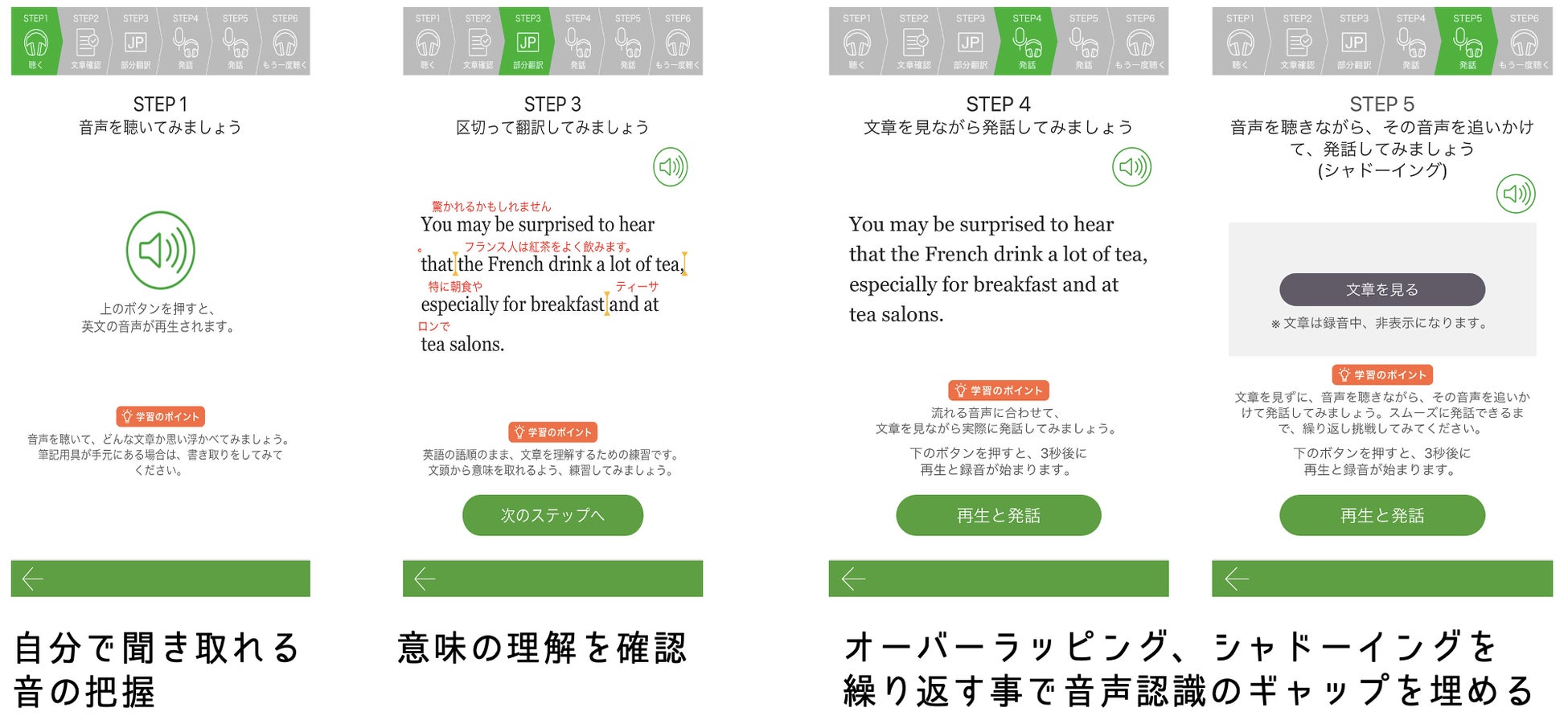 音声確認→内容確認→オーバーラッピング→シャドーイングという段階的な学習が行えます。弱く発声される音、文章の中で変化する音など日本人には聞き取りづらい音も正しく聞き取れるようになります。