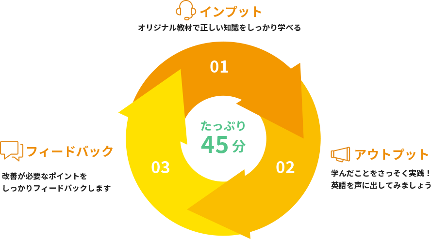 先生と一緒に正しい知識のインプット⇨英会話の実践⇨フィードバックまで1レッスンの中で実施していきます。