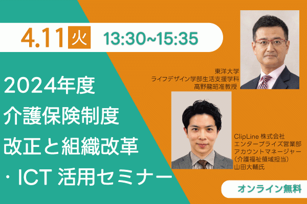 2023年4月11日(火)オンライン無料開催 「2024年度 介護保険制度改正と組織改革・ICT活用セミナー」 高齢者住宅新聞社主催/ClipLine共催