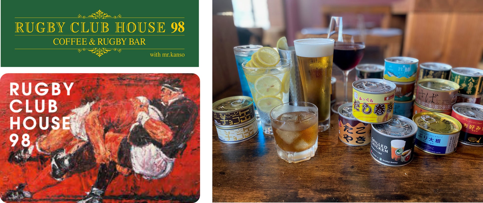 「ラグビークラブハウス98」 COFFEE & RUGBY BARは、ラグビーをプレーする人、応援する人など、ラグビーを愛する仲間が気軽に集い、語り合える場になって欲しいという想いから生まれたラグビーをテーマにした完全キャッシュレス缶詰バーです。2023年1月31日に大阪府豊中市にオープン。店内には日本代表伝説のロック 林敏之さんの大型の絵や日本のフロントローが飾られています。缶詰バーを全国に店舗展開するmr.kansoがプロデュースする缶詰が豊富に揃っているほか、元ラグビー選手である正面健司氏の焙煎所のコーヒー豆を使用したコーヒーを提供しています。