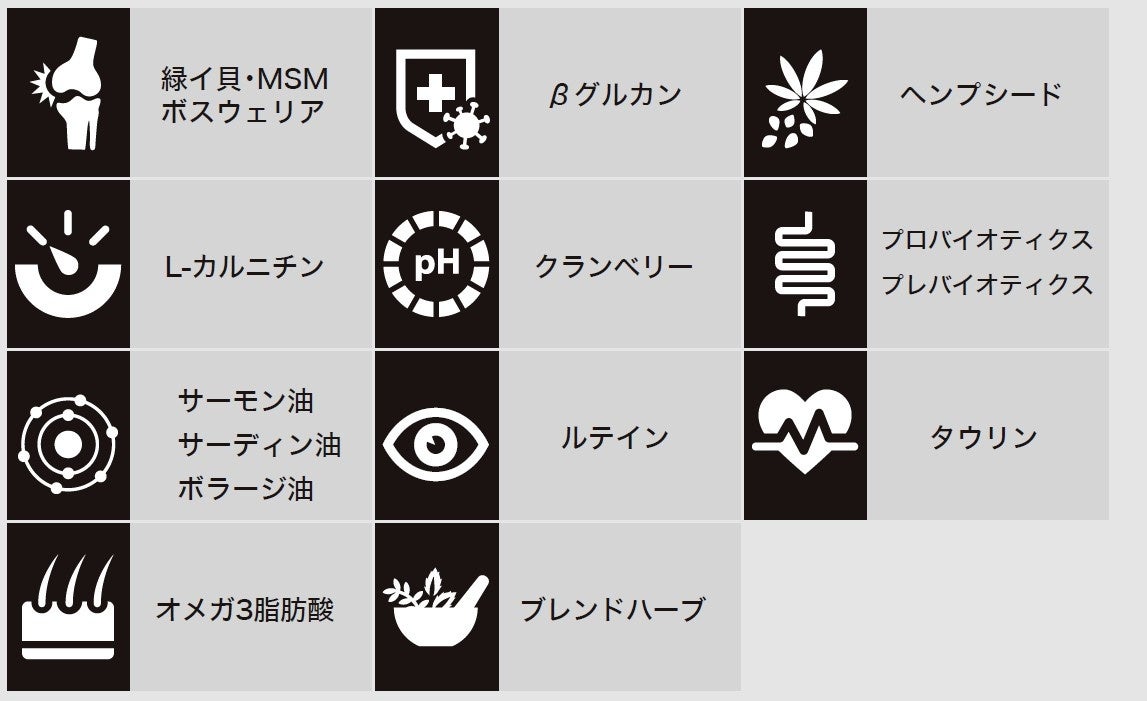 関節、免疫、体重、心臓、目、おなか、尿路、皮膚被毛など、11種の健康維持成分を配合しています。