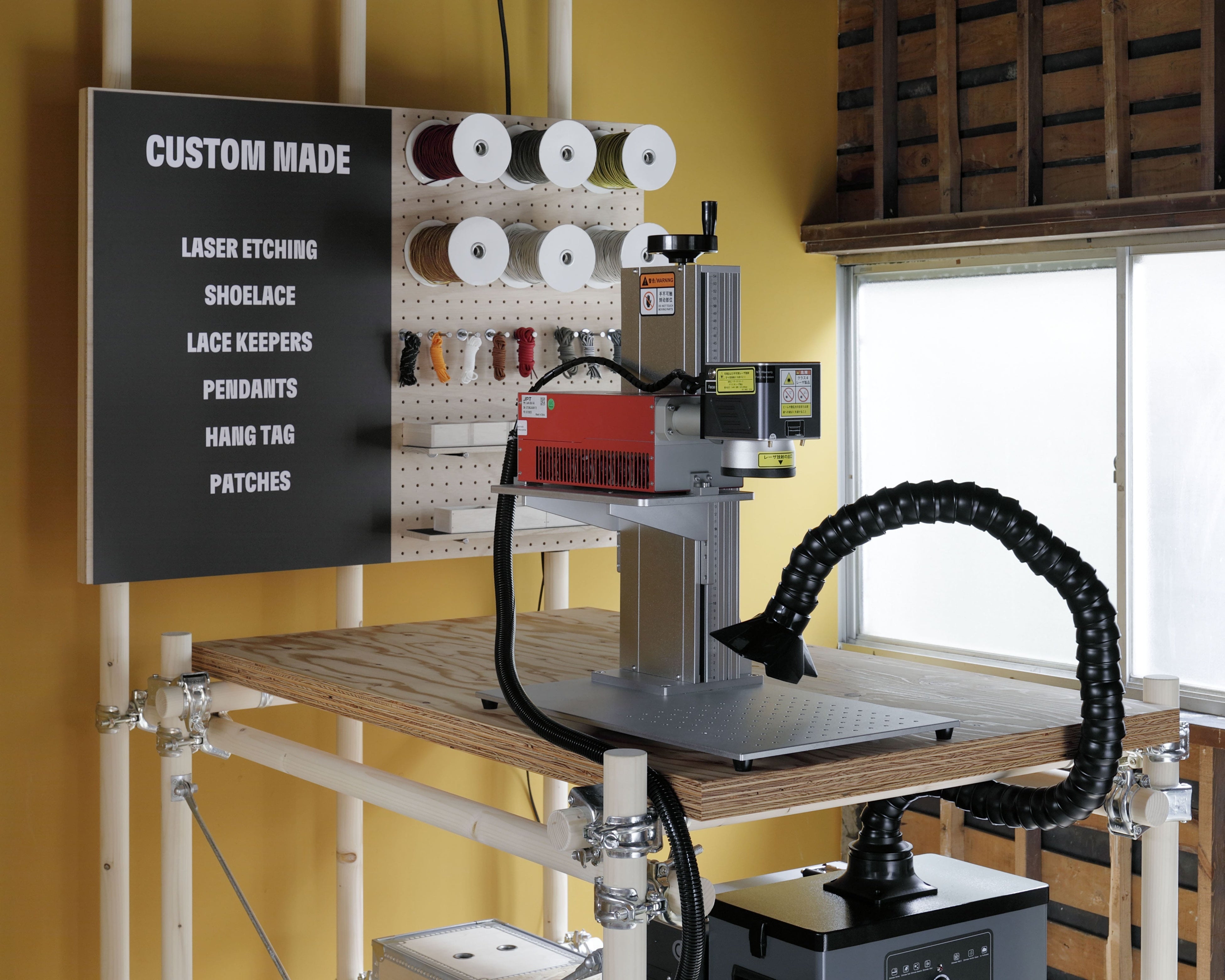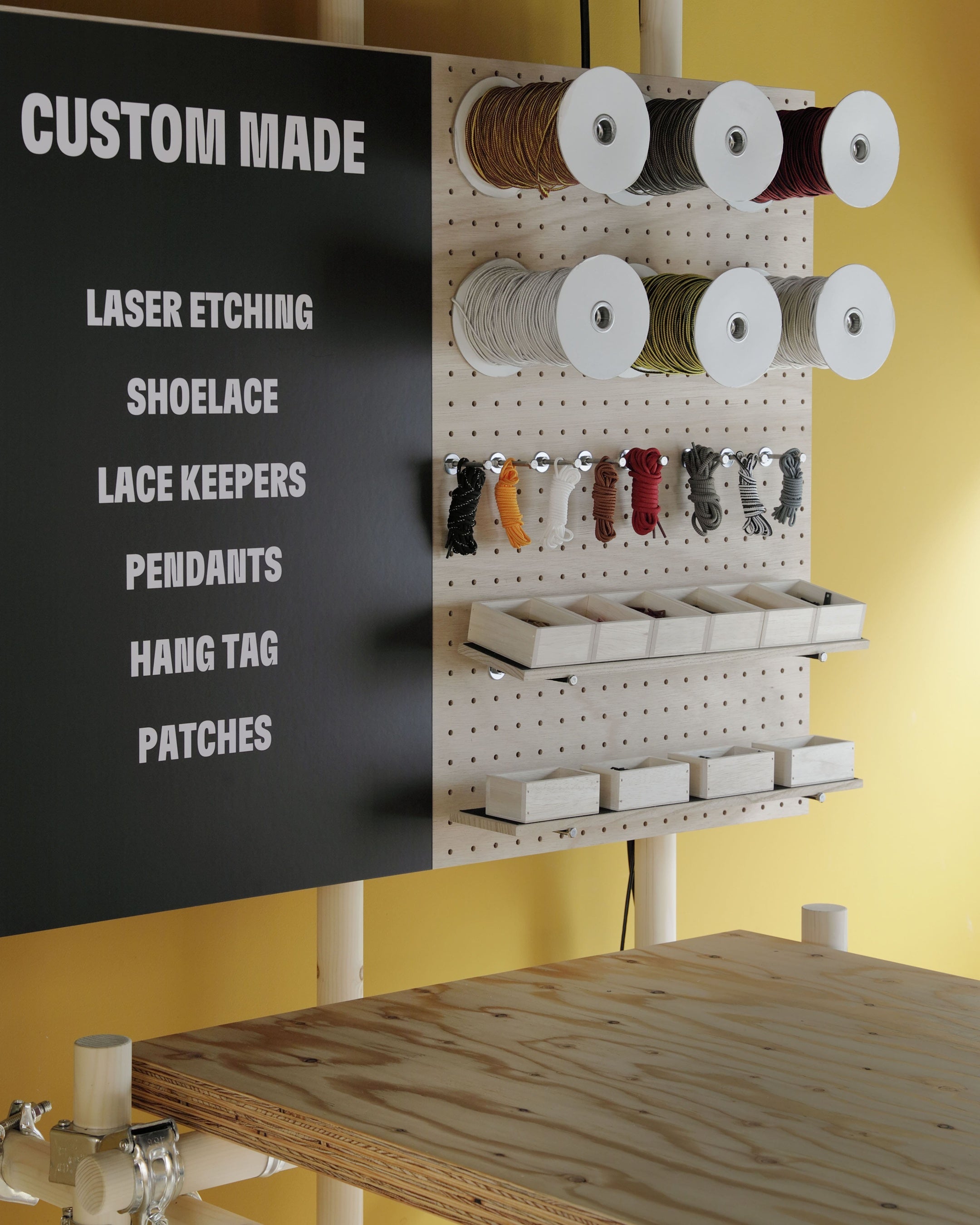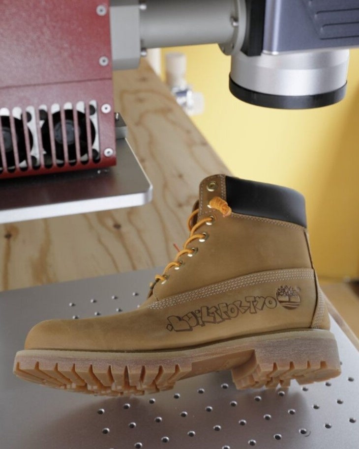 店舗2階では、日本初となるカスタマイズサービス「カスタム メイド」を提供いたします。最新技術を駆使したレーザー刻印だけでなく、店舗限定のチャームとシューレース、ペンダントを用意し、自分だけの「イエローブーツ」のカスタムが可能です。また、一部対象商品のアパレル購入時に選べる限定ワッペンもあり、店舗にて圧着まで承ります。さらに、不定期でアーティストのアートワークをプリントするサービスも予定しています。そして、ご購入いただいた商品以外でもティンバーランドのシューズをご持参いただいた方を対象に、無料でクリーニングサービスを行う予定です。