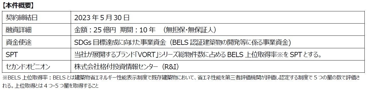 当社が展開する「VORT」シリーズおよび管理物件は、都心5区を中心に170棟を超えており、建築物省エネルギー性能表示制度 BELS認証(Building-Housing Energy-efficiency Labeling System)を取得した実績は、42棟(2023年5月現在)に上っています。優れた環境性能を有する不動産の形成により、CO2排出量の削減等、環境や社会への配慮に努めています。このたびのSLLは、当社は下記のようにSPTを設定し、毎年3月末の会計年度の判定値における達成状況により、東和銀行の貸付金利引き下げを条件とするものです。