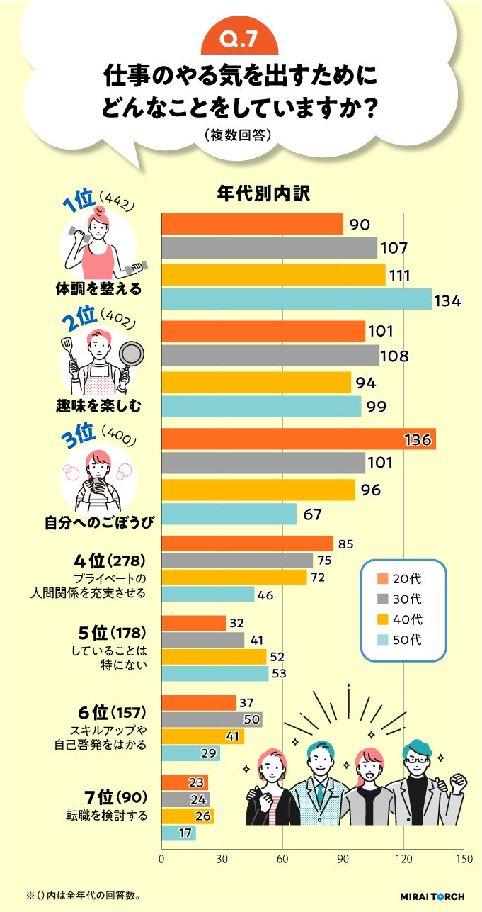 仕事のやる気を出すための行動について、全年代で最も多かったのは「体調を整える」でした。しかし年代別に見ると、20代は「自分へのごほうび」、30代は僅差で「趣味を楽しむ」と回答した人数が最多となっています。