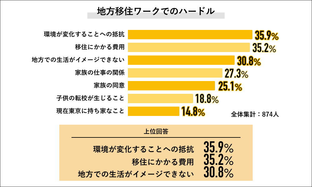 地方移住を検討する上でハードルになっていることを聞くと、「環境が変化することへの抵抗」が35.9%で最多回答になり、次いで「移住にかかる費用」が35.2%、「地方での生活がイメージできない」が30.8%、「家族の仕事の関係」が27.3%、「家族の同意」が25.1%で上位5つの回答結果になりました。