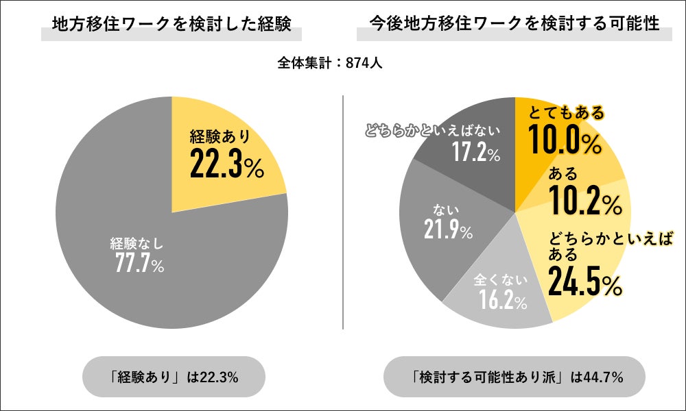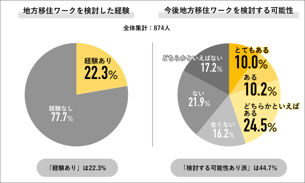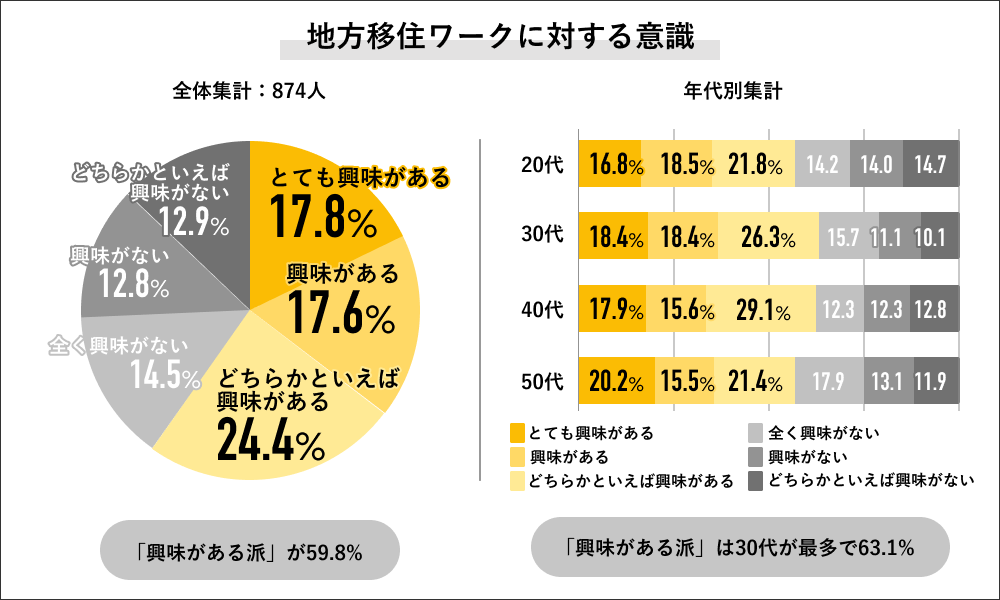 そこでJob総研では874人の社会人男女を対象に、地方移住の興味度とその理由、また実際に検討した経験の有無と今後の検討可能性、さらに地方移住にハードルを感じること及び、移住支援金に対しての魅力有無とその認知度などについて調査した「2023年 地方移住の意識調査」を実施しました。