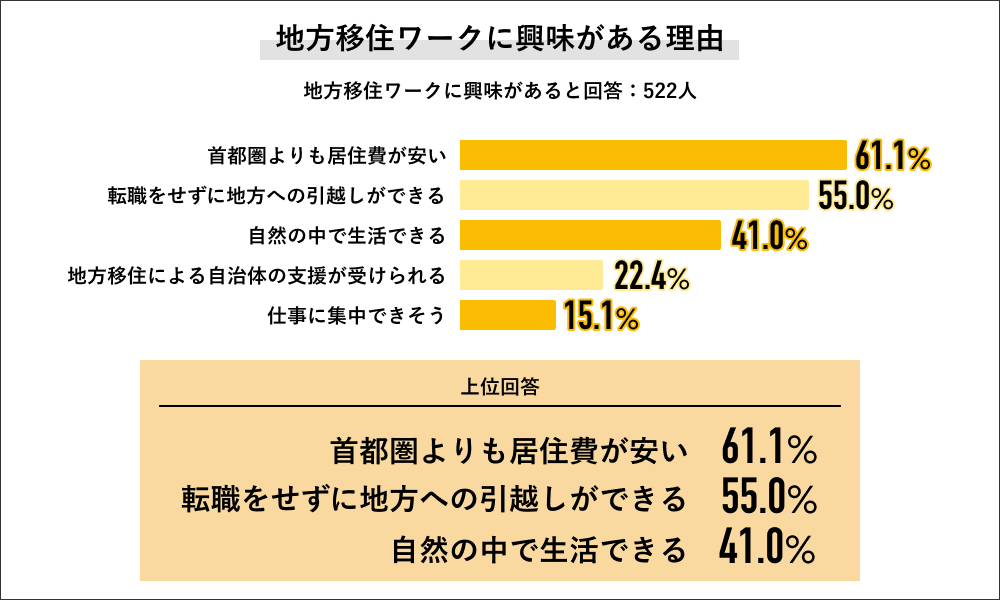 地方移住ワークに”興味がある派”を回答した522人にその理由を聞くと、「首都圏よりも居住費が安い」が61.1%で最多回答になり、次いで「転職をせずに地方へ引っ越しができる」が55.0%、「自然の中で生活できる」が41.0%で上位3つの回答結果になりました。下位回答では「自治体の支援が受けられる」が22.4%、「仕事に集中できそう」が15.1%でした。