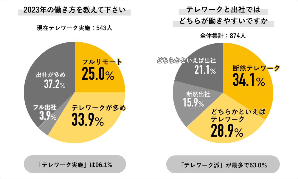 現状の働き方については、「フルリモート」25.0%、「テレワークが多め」33.9%、「出社が多め」37.2%を合算した96.1%が大なり小なり”テレワークを実施”している結果になりました。