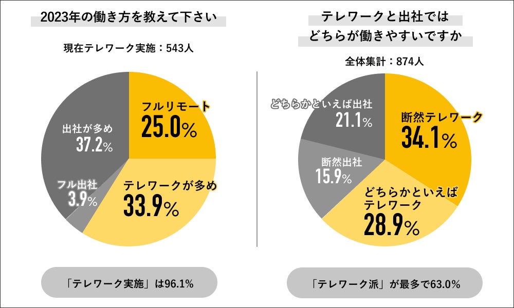働きやすいスタイルについては、「断然テレワーク」34.1%、「どちらかといえばテレワーク」28.9%を合算した63.0%が”テレワーク派”の回答をしました。