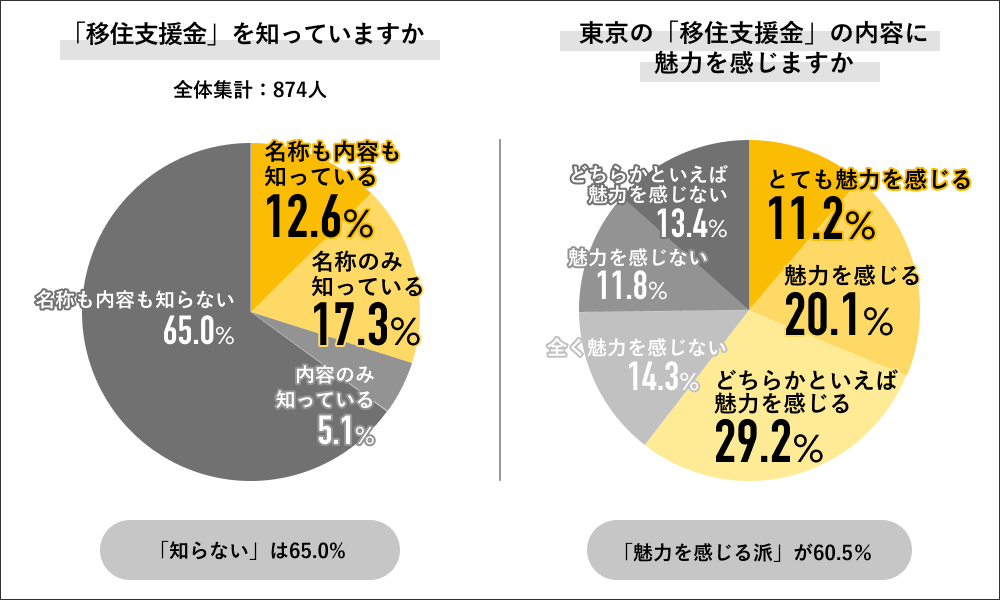 自治体の打ち出す移住支援金についての認知度を見ていくと、「名称も内容も知っている」が12.6%、「名称のみ知っている」が17.3%、「内容のみ知っている」が5.1%で、合算した35.0%が移住支援金の存在を認知している結果になりました。また内容を知った上での魅力について聞くと、「とても魅力を感じる」11.2%、「魅力を感じる」20.1%、「どちらかといえば魅力を感じる」29.2%を合算した60.5%が”魅力を感じる派”の回答をしました。